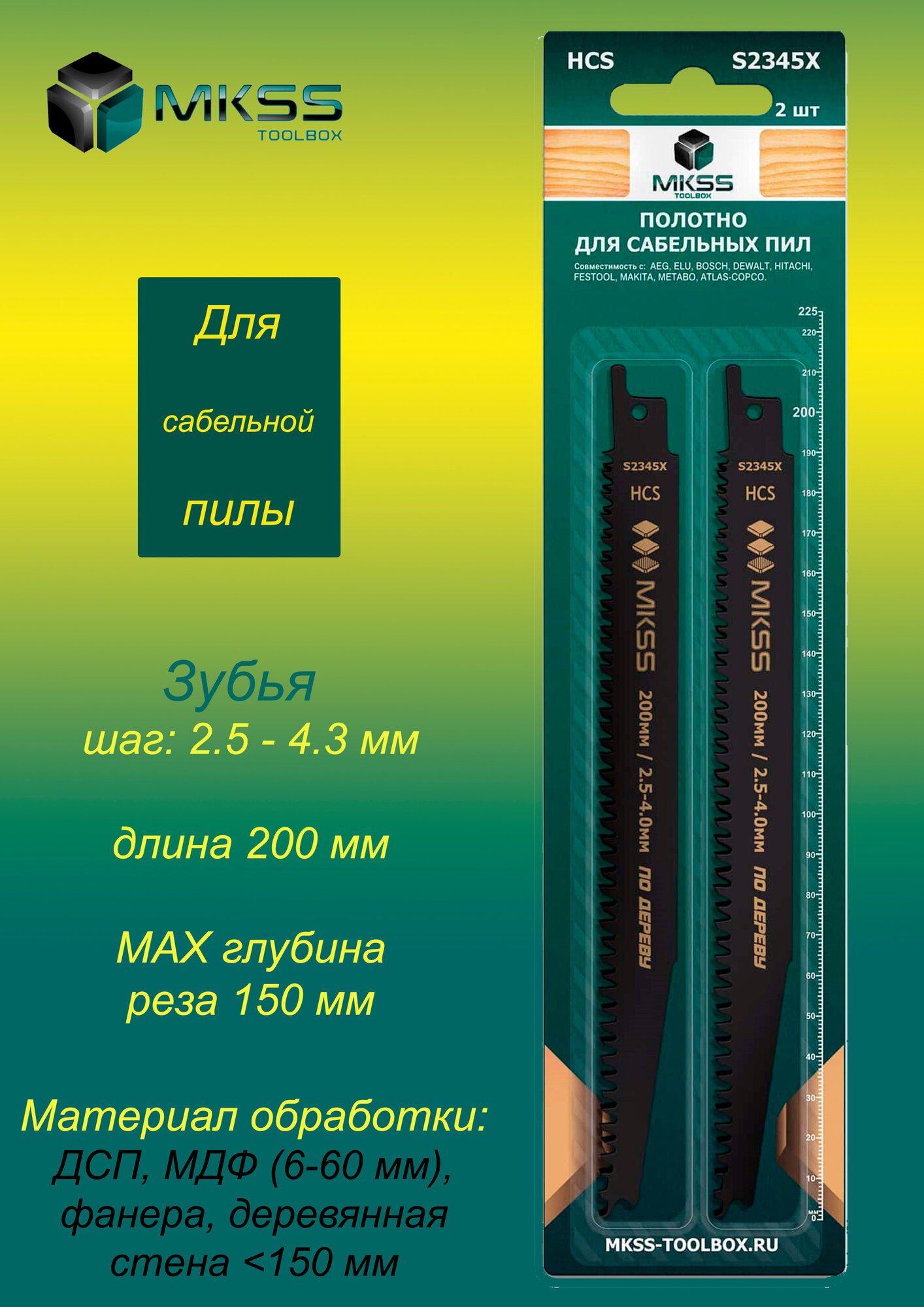 Полотно ПО ДЕРЕВУ, ДСП, МДФ, ФАНЕРЕ для сабельной пилы S2345X, 200 мм/2.5-4.0 мм, 2 штуки, MKSS информация: