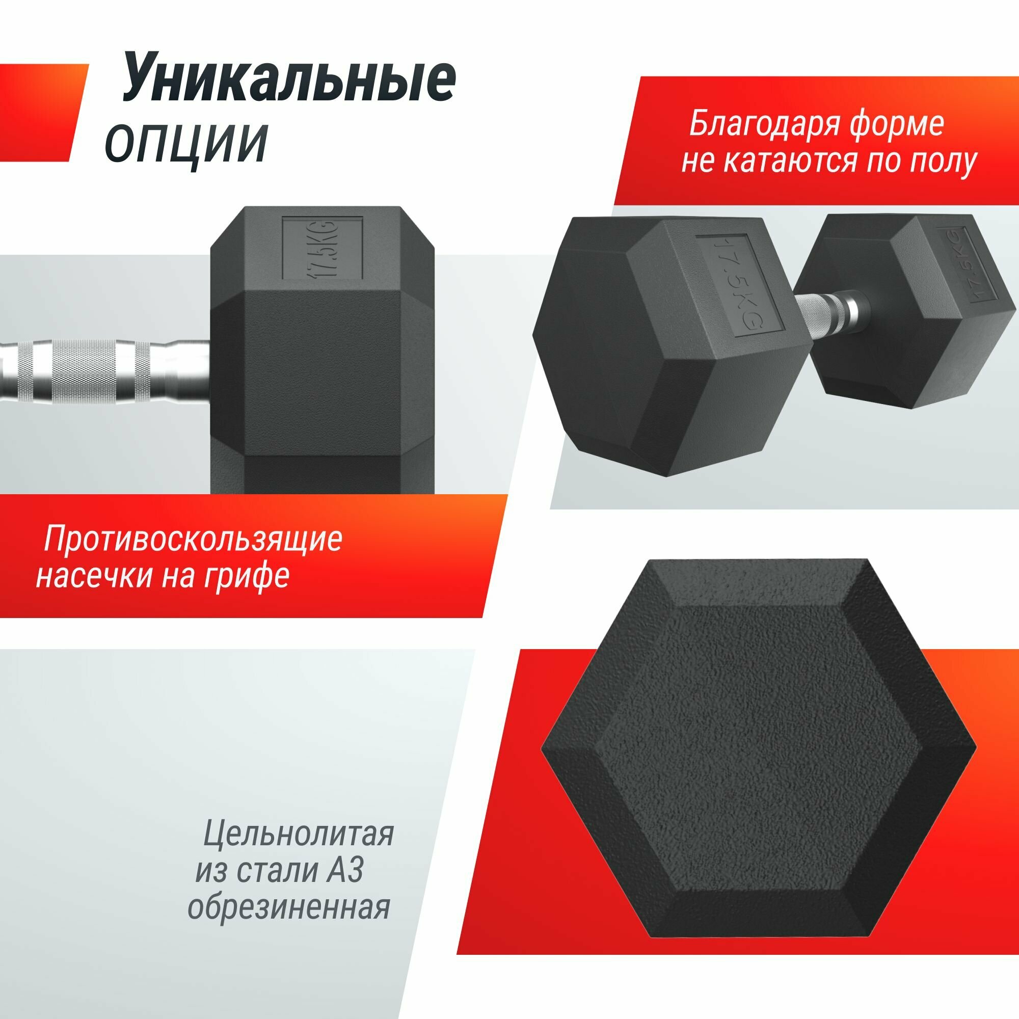 Гантель гексагональная UNIX Fit обрезиненная, прорезиненная спортивная гантеля, с металлической ручкой, литая, неразборная, 17,5 кг, 1 шт. информация:
