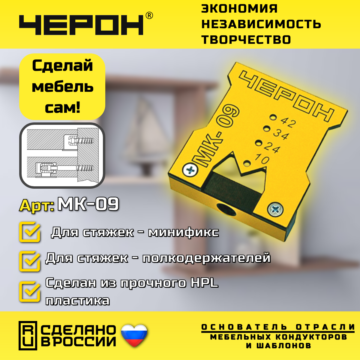 Мебельный кондуктор Черон МК-09 для эксцентриковых стяжек (минификс), стяжек-полкодержателей, конических стяжек информация: