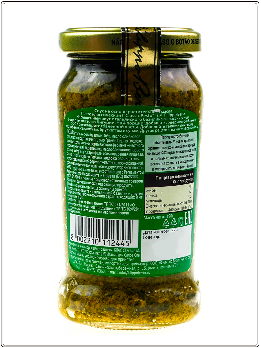 Соус Песто классический с базиликом, 190г. * 6 шт. информация: