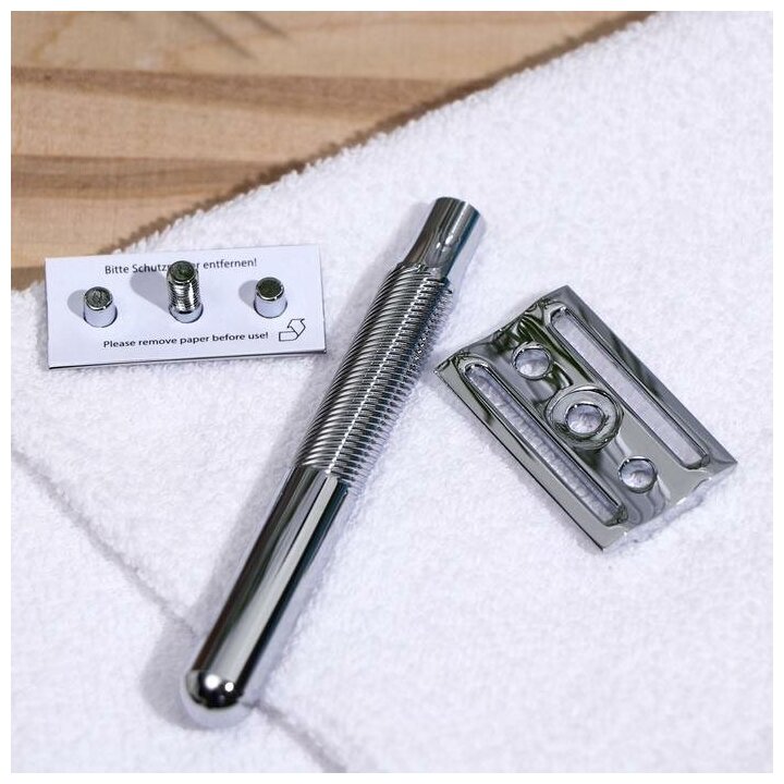 Дополнительная информация | как вставить новое лезвие: 1.Удерживая бритву вверх ногами, открутите ручку и снимите защитный гребень и старое лезвие 2. Установите новое лезвие на крышку, используя центральный винт и две опорные стойки, чтобы лезвие располагалось ровно 3. Установите на место защитный гребень и прикрепите ручку, проворачивая ее почасовой стрелке до полного закрепления |