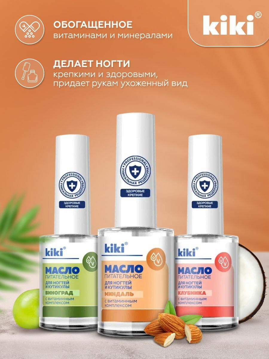 Масло для ногтей и кутикулы kiki для маникюра, педикюра, укрепление питание восстановление, с натуральным миндальным маслом и витаминами А, Е, С, D, 12 мл аромат миндаль информация: