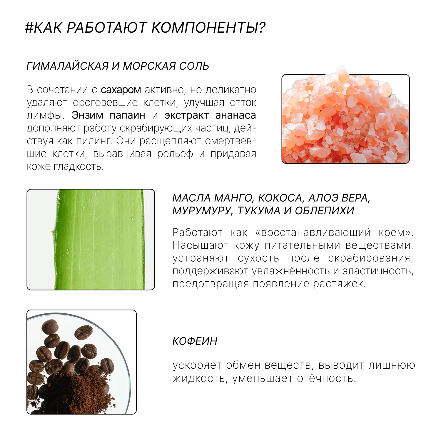 | Активный ингредиент | глицерин / кокосовое молоко / кофе / кофеин / морская соль / папаин |