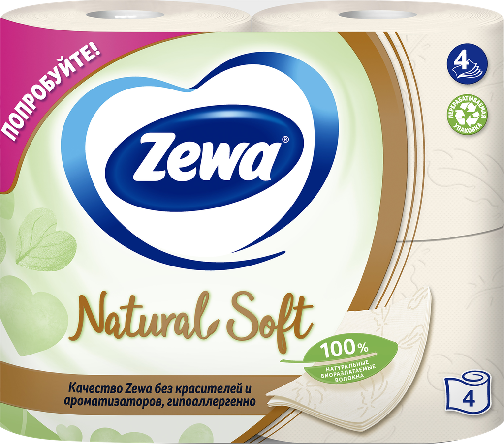 Туалетная бумага Zewa Natural Soft, 4 слоя, 4 рулона