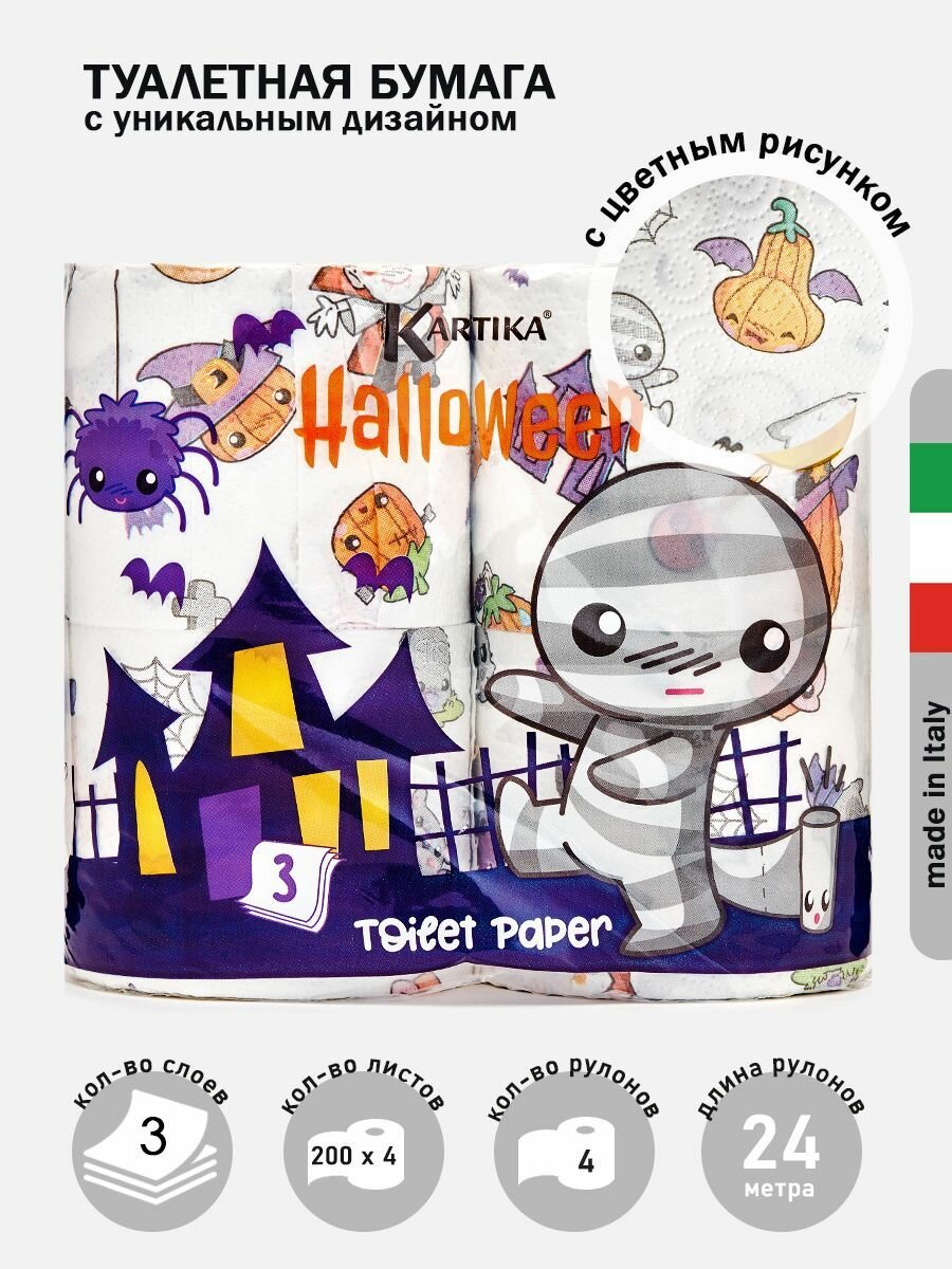 10 цен на Туалетная бумага с рисунком "Helloween" 3 слоя, 4 рулона по 200 листов, World Cart
