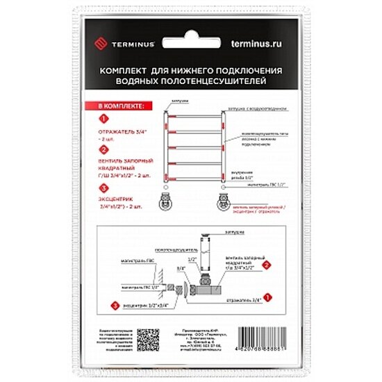 Комплект TERMINUS подключения полотенцесушителей: вентиль угл г/ш 3/4"х1/2" квадрат(2шт), эксцентрик 3/4"(2шт), отраж. 3/4"(2шт), гарантия 1 год