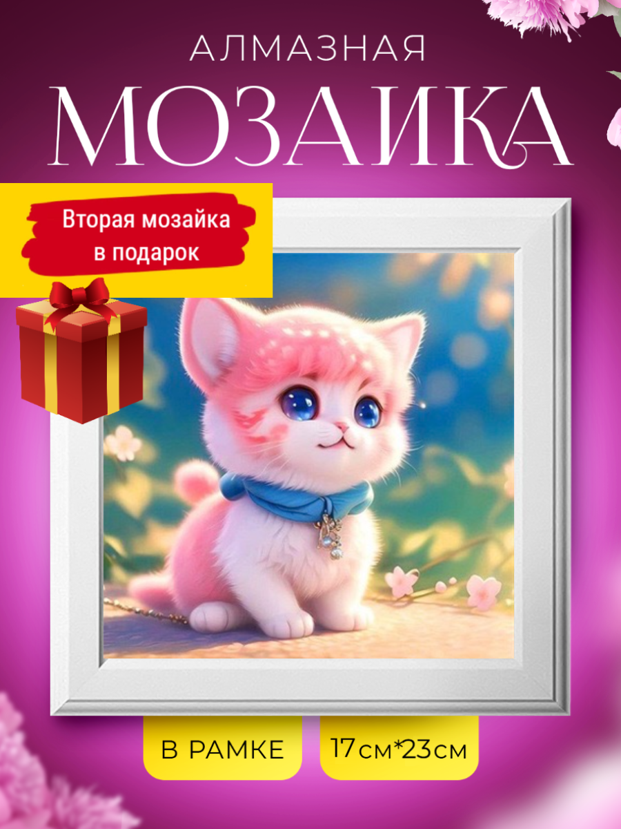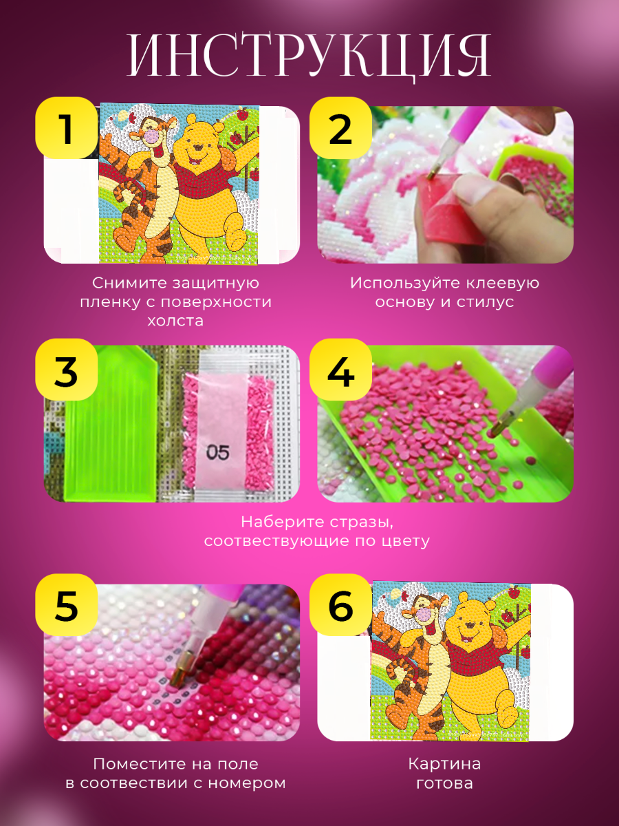 | Комплектация | аксессуары и инструменты для алмазной мозаики (стилус, лоток, гелевая подушечка), холст с липким слоем, набор комплект страз, рамка |
