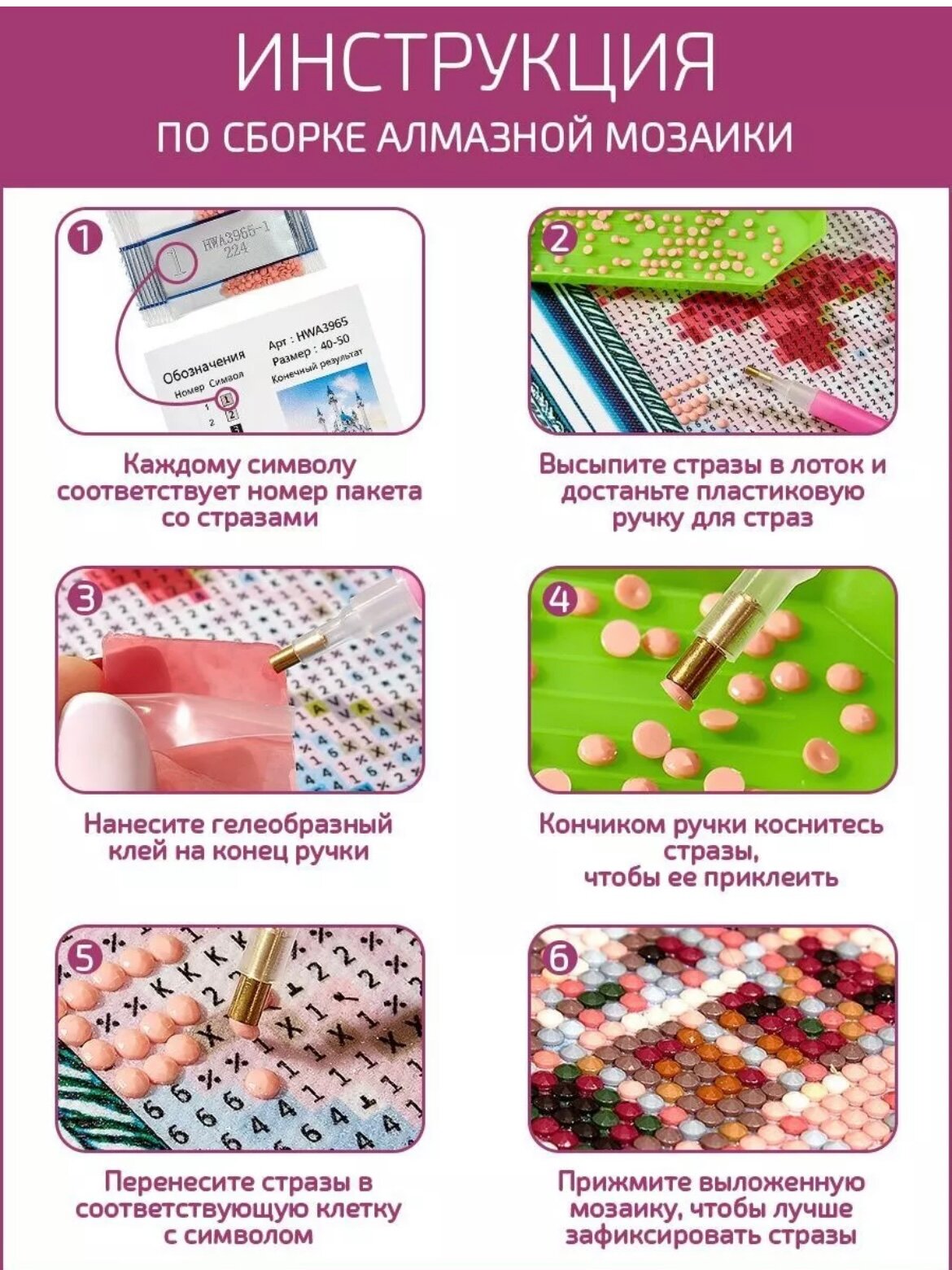 | Комплектация | аксессуары и инструменты для алмазной мозаики (стилус, лоток, гелевая подушечка), холст с липким слоем, набор комплект страз, рамка |