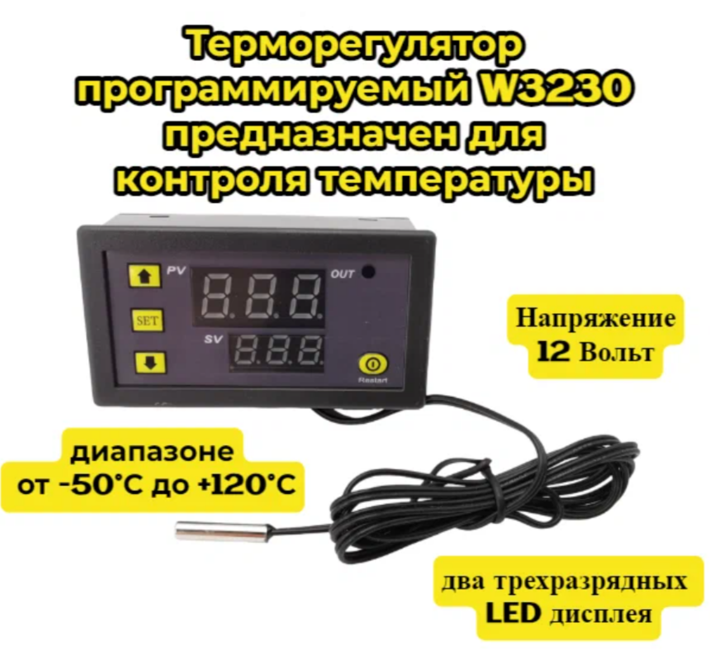 Терморегулятор программируемый W3230 предназначен для контроля температуры от -50°С до +120°С , напряжение 12 вольт информация: