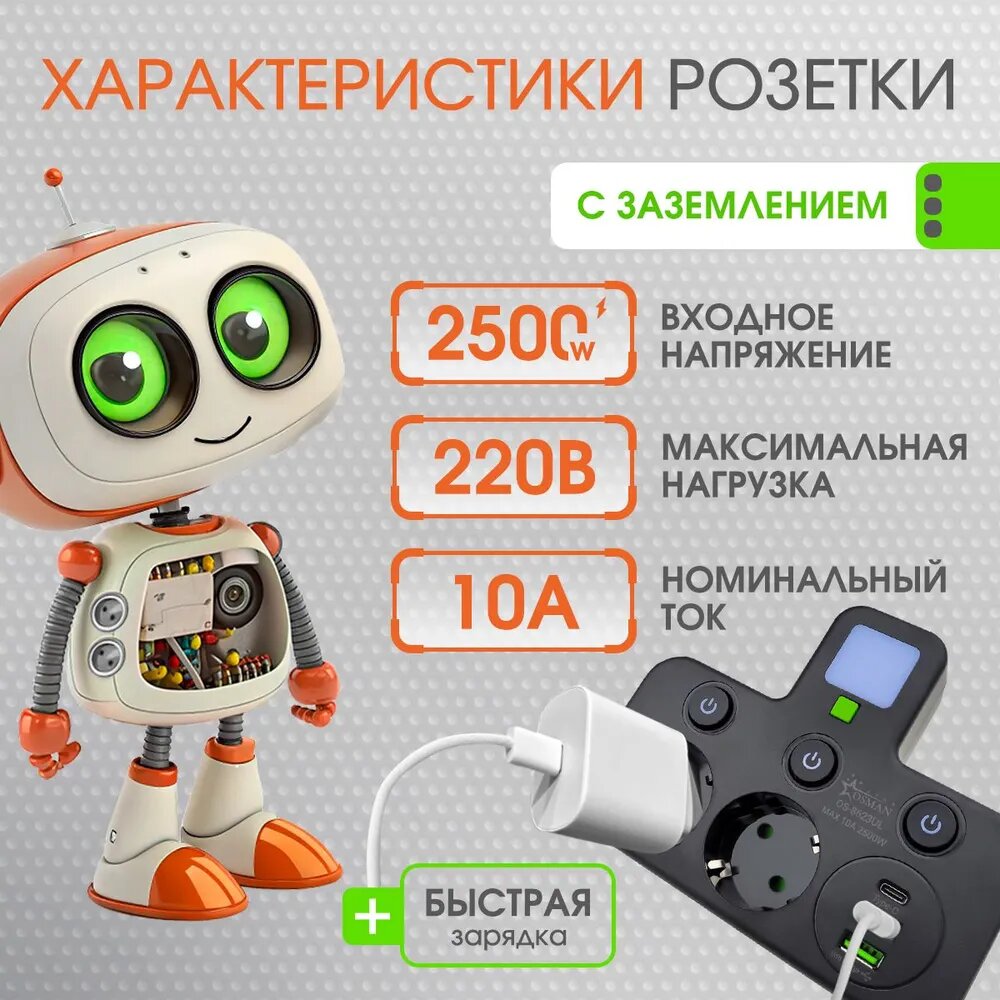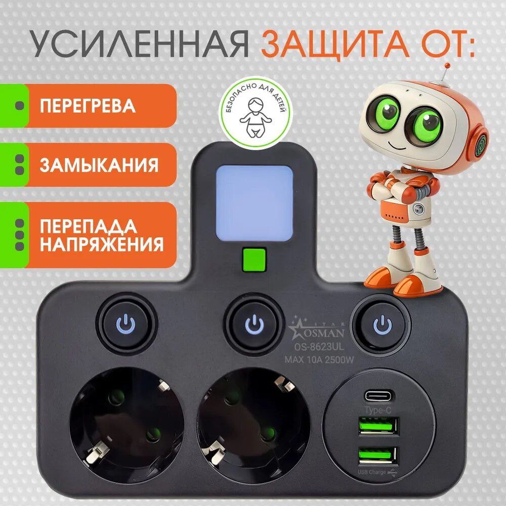 10 цен на Сетевой фильтр двойник для розетки с 2 USB и Type-C