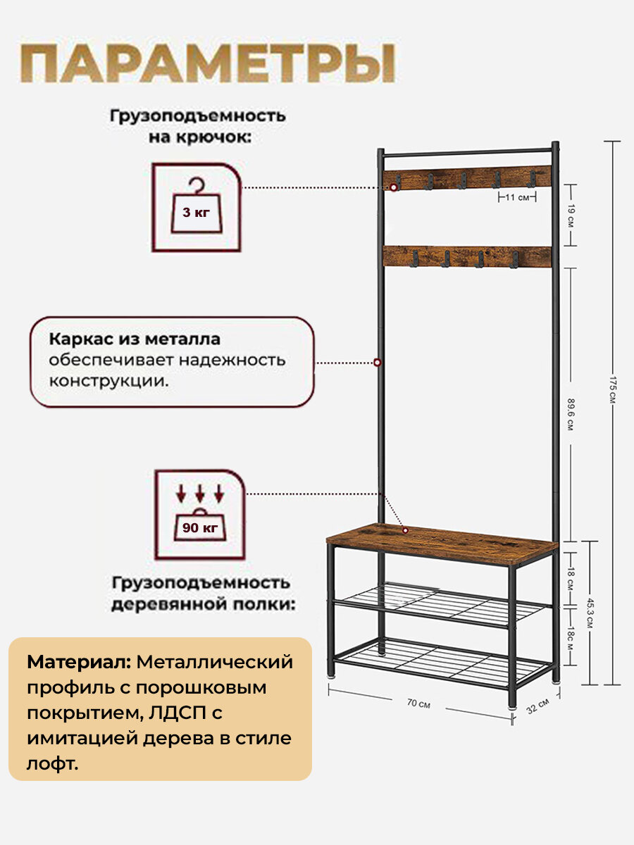 10 цен на Вешалка напольная с полкой для обуви в стиле лофт премиум «AV Craft» 9 крючков, 3 полки