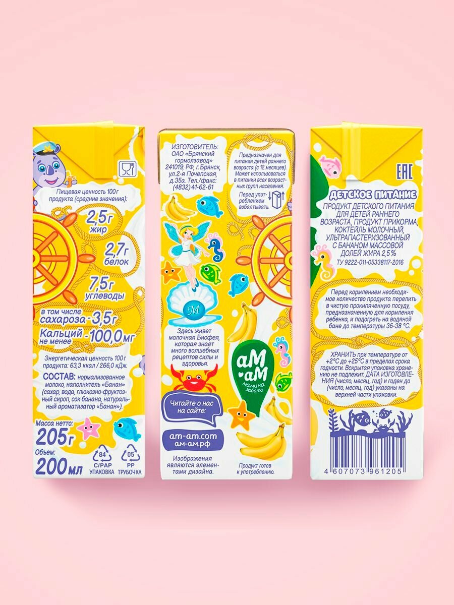 | Состав | нормализованное молоко, наполнитель "Банан" (сахар, глюкозо-фруктозный сироп, сок банана, натуральный ароматизатор "Банан"). |