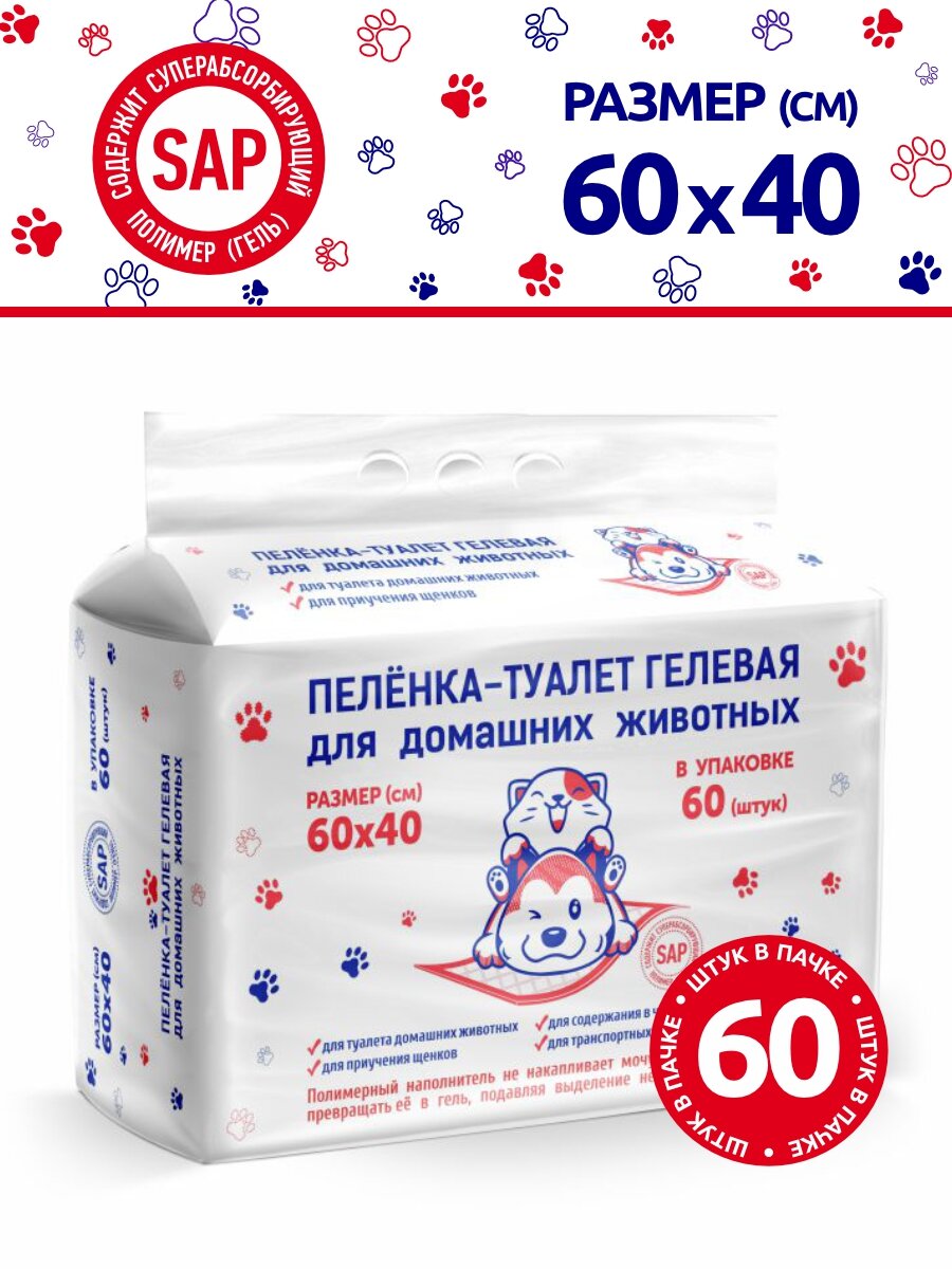 Пеленка-туалет гелевая впитывающая одноразовая 60х40 см, уп. 60 шт информация: