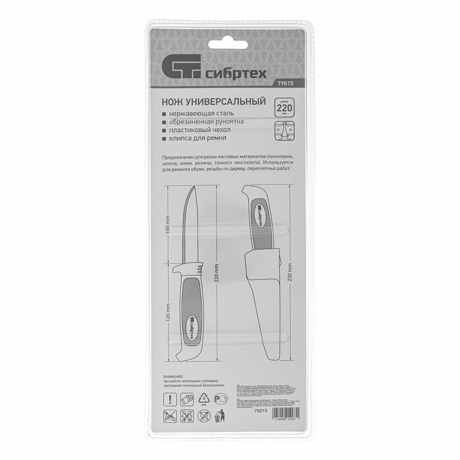 Нож универсальный с чехлом, обрезиненная рукоятка, 220 мм, лезвие 100 мм Сибртех, 79015 информация: