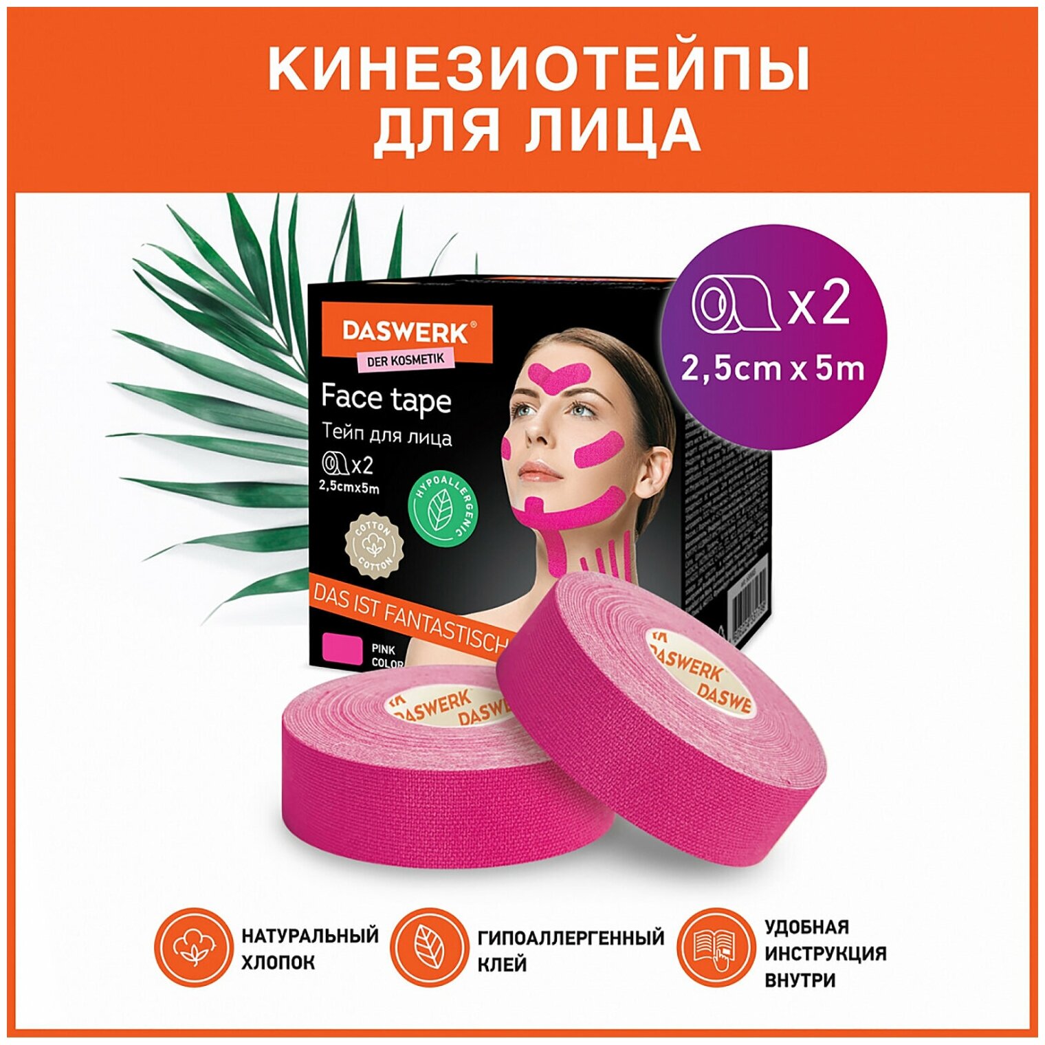 Кинезио тейп/лента для лица, лифтинг эффект, 2,5 см х 5 м, комплект, 2 рулона, розовый, DASWERK, 680013