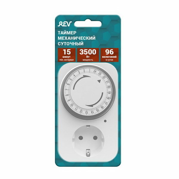 Таймер розеточный REV, механический, 3680 Вт, до 96 вкл./выкл. сутки, интервал 15 мин.,белый