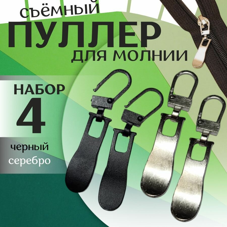 Пуллер для молнии съемный, крепление, язычок на бегунок, набор 4 штуки, цвет черный и серебристый 277 ₽