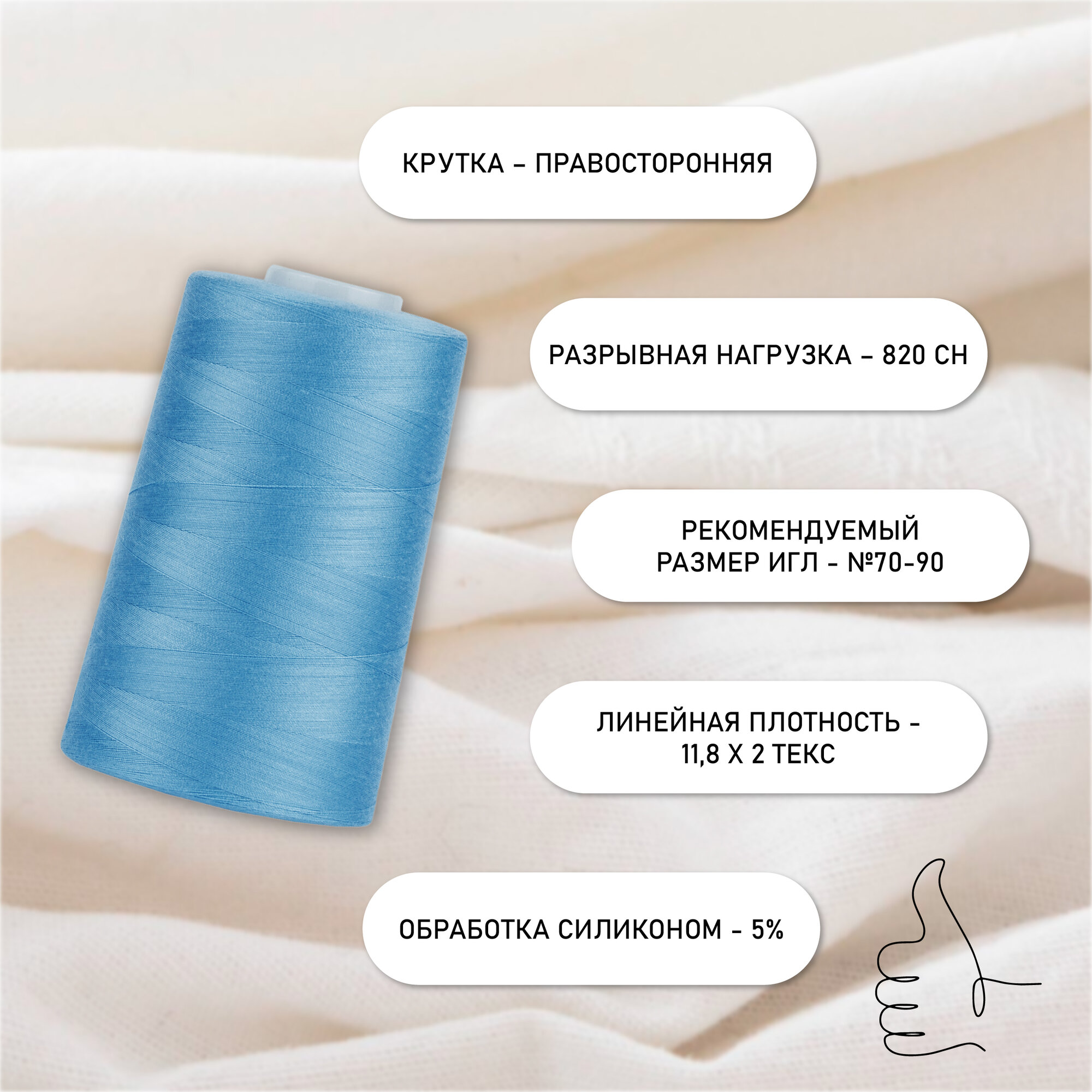 Нитки швейные 50/2 полиэстер 5000 ярд цв.309 голубой MAX информация: