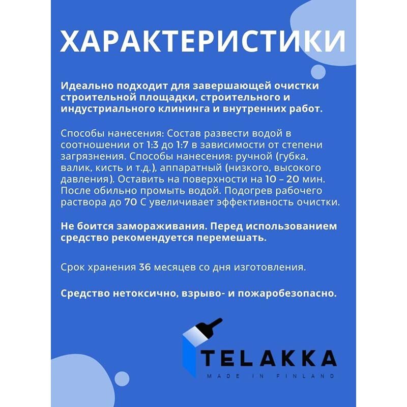 Средство очиститель для удаления цемента, бетона, цементной затирки с плитки швов, с керамогранита, известкового налета TELAKKA CEMENT 1л информация:
