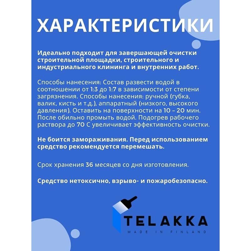 Средство очиститель для удаления цемента, бетона, цементной затирки с плитки швов, с керамогранита, известкового налета TELAKKA CEMENT 10л информация: