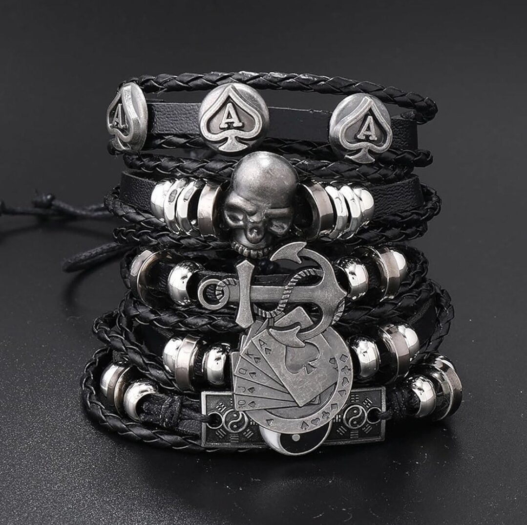 | Дополнительная информация | Браслет на завязках безразмерный, кожаный, бижутерия, украшение на руку, комплект\набор 5 в 1 |