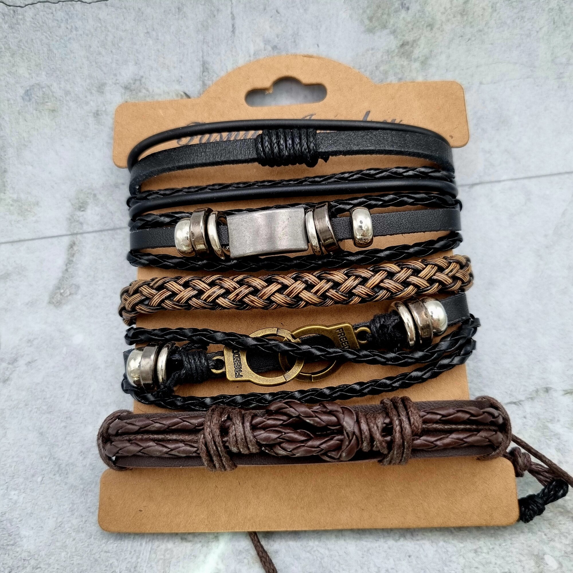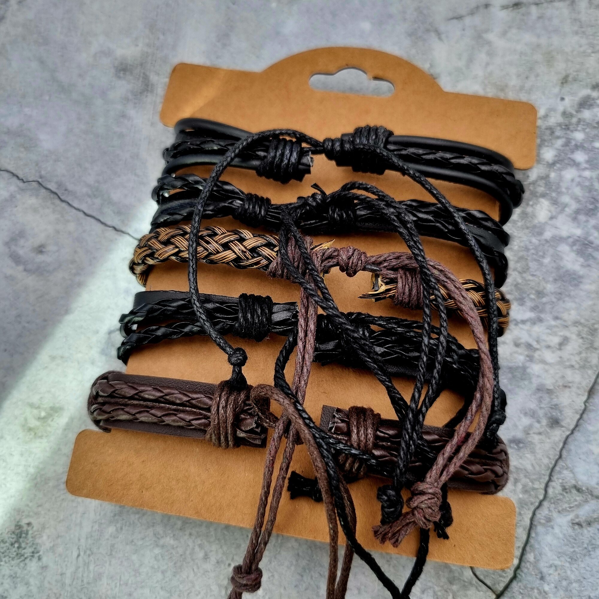 | Дополнительная информация | Браслет на завязках безразмерный, кожаный, бижутерия, украшение на руку, комплект\набор 5 в 1 |