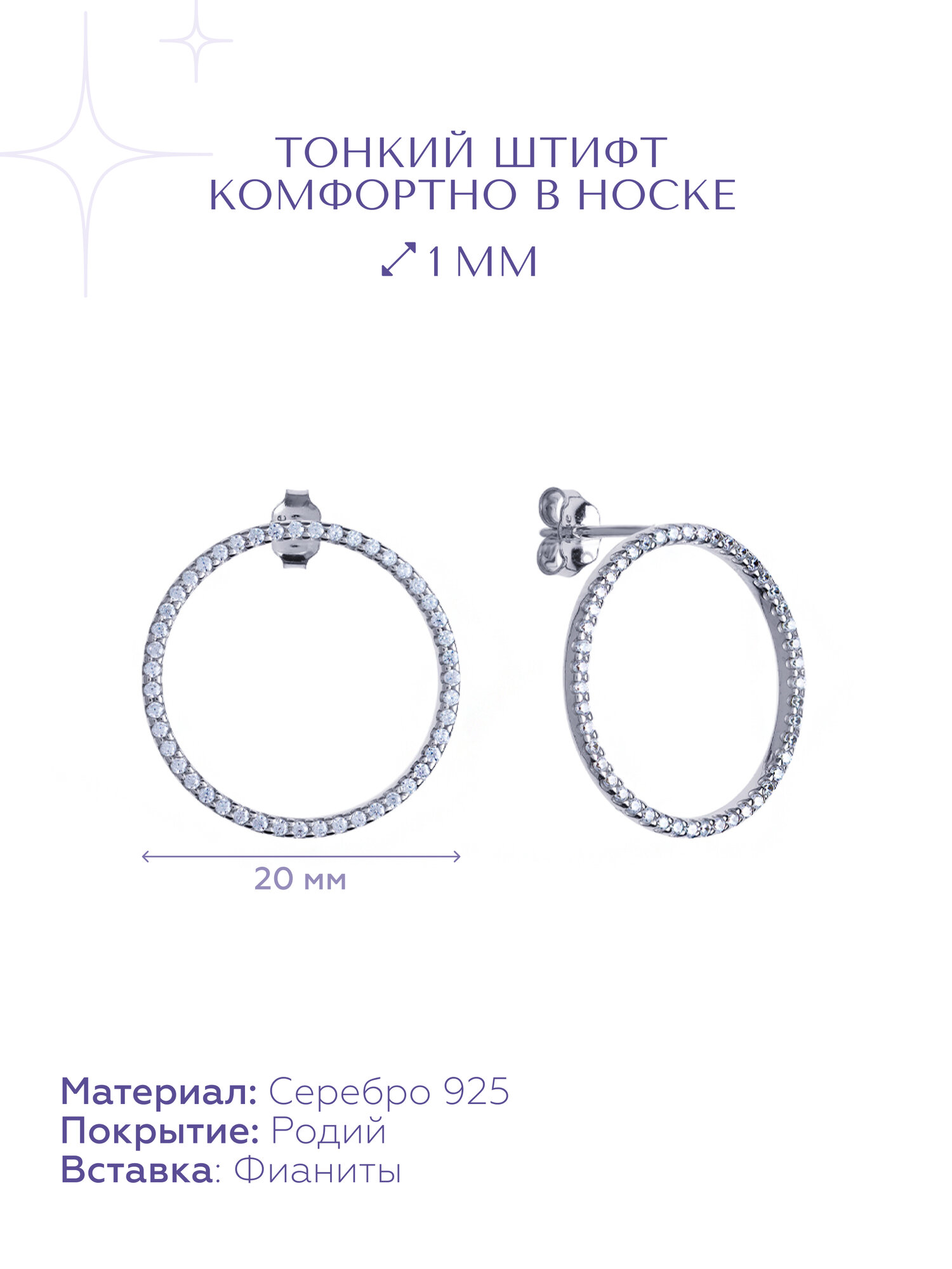 Отзывы на Серьги пусеты MIESTILO, серебро, 925 проба, родирование, фианит, размер 20 мм, , серебристый