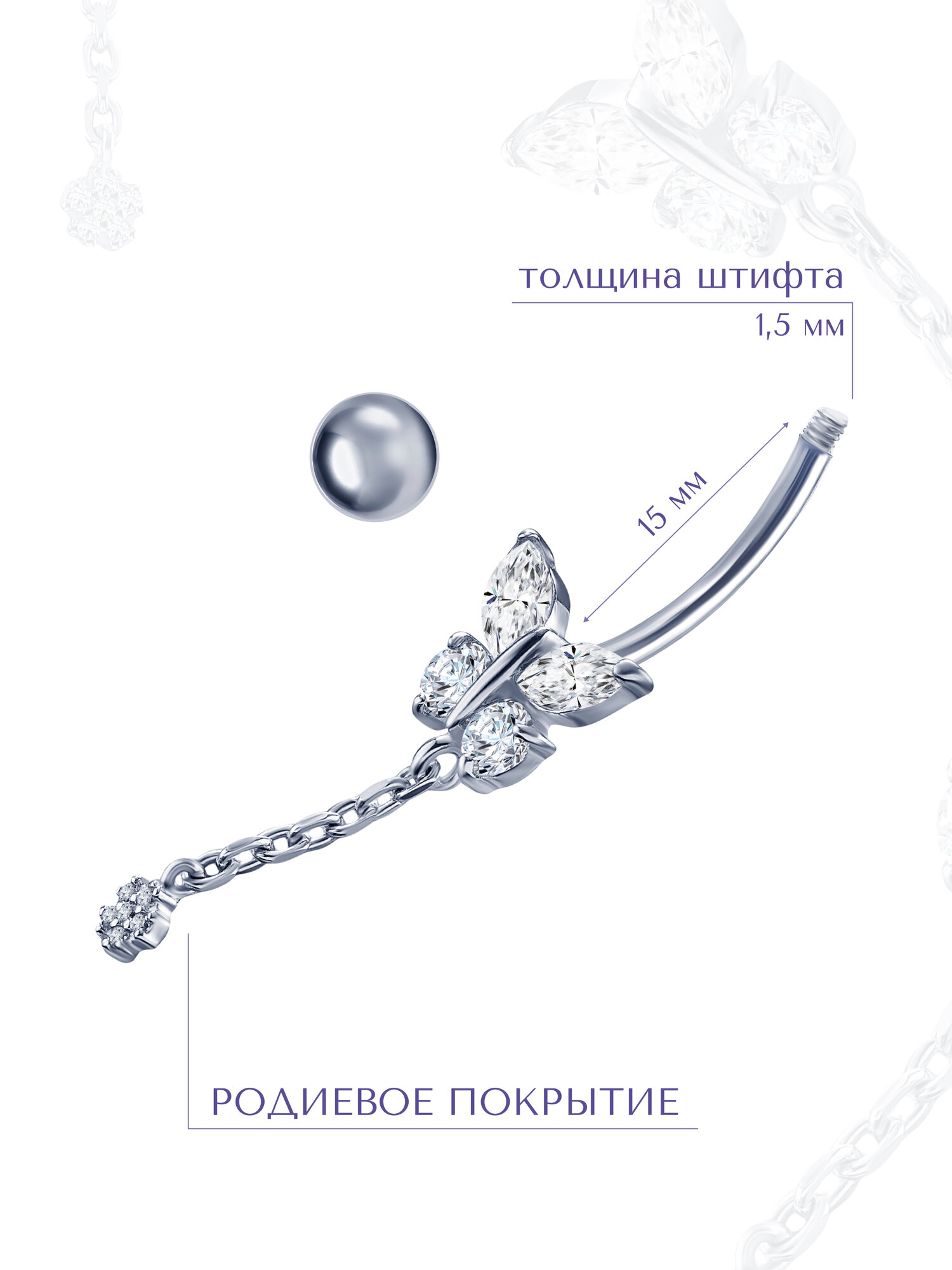 Пирсинг в пупок MIESTILO, серебро, 925 проба, родирование, фианит, средний вес 1.3 гр., длина 2.1 см., белый, серебристый, серый информация: