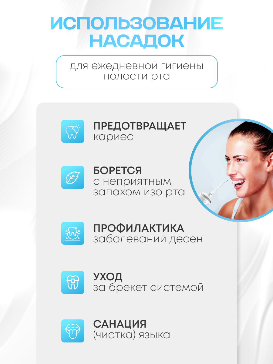 | Тип насадки | для ежедневной чистки / для имплантов / для чистки языка / ортодонтическая / пародонтическая насадка |