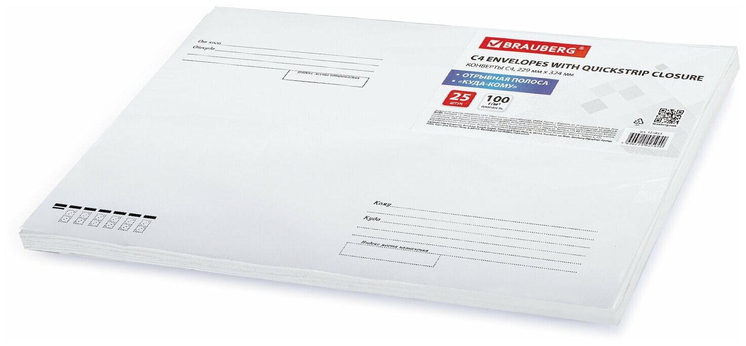 Конверты С4 (229х324 мм), отрывная лента, "Куда-Кому", 100 г/м2, комплект 25 шт, BRAUBERG, 121853 информация: