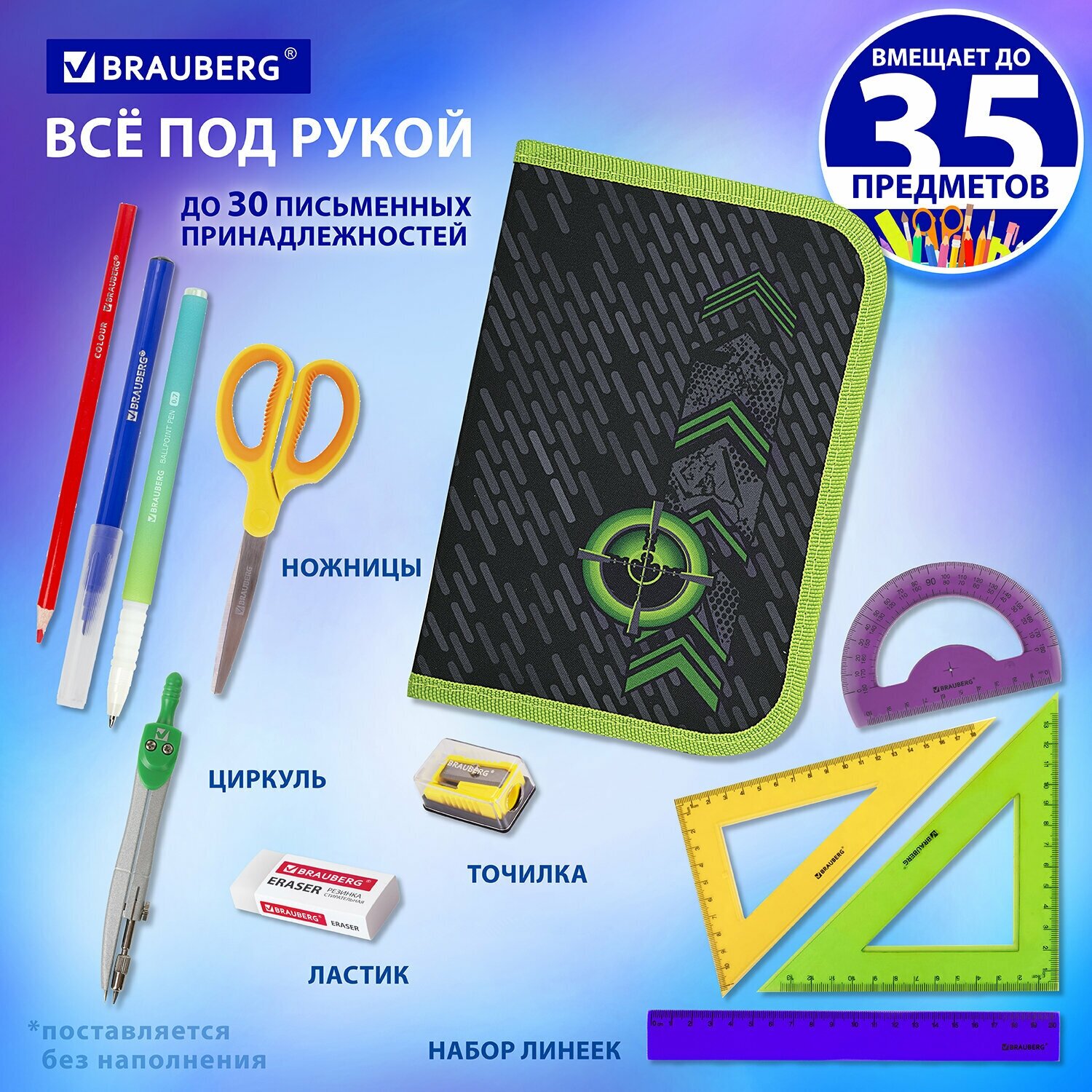 Пенал школьный с наполнением для ручек, карандашей для мальчика / подростка с наполнением Brauberg 1 отделение, 24 предмета, 21х14см, 271528