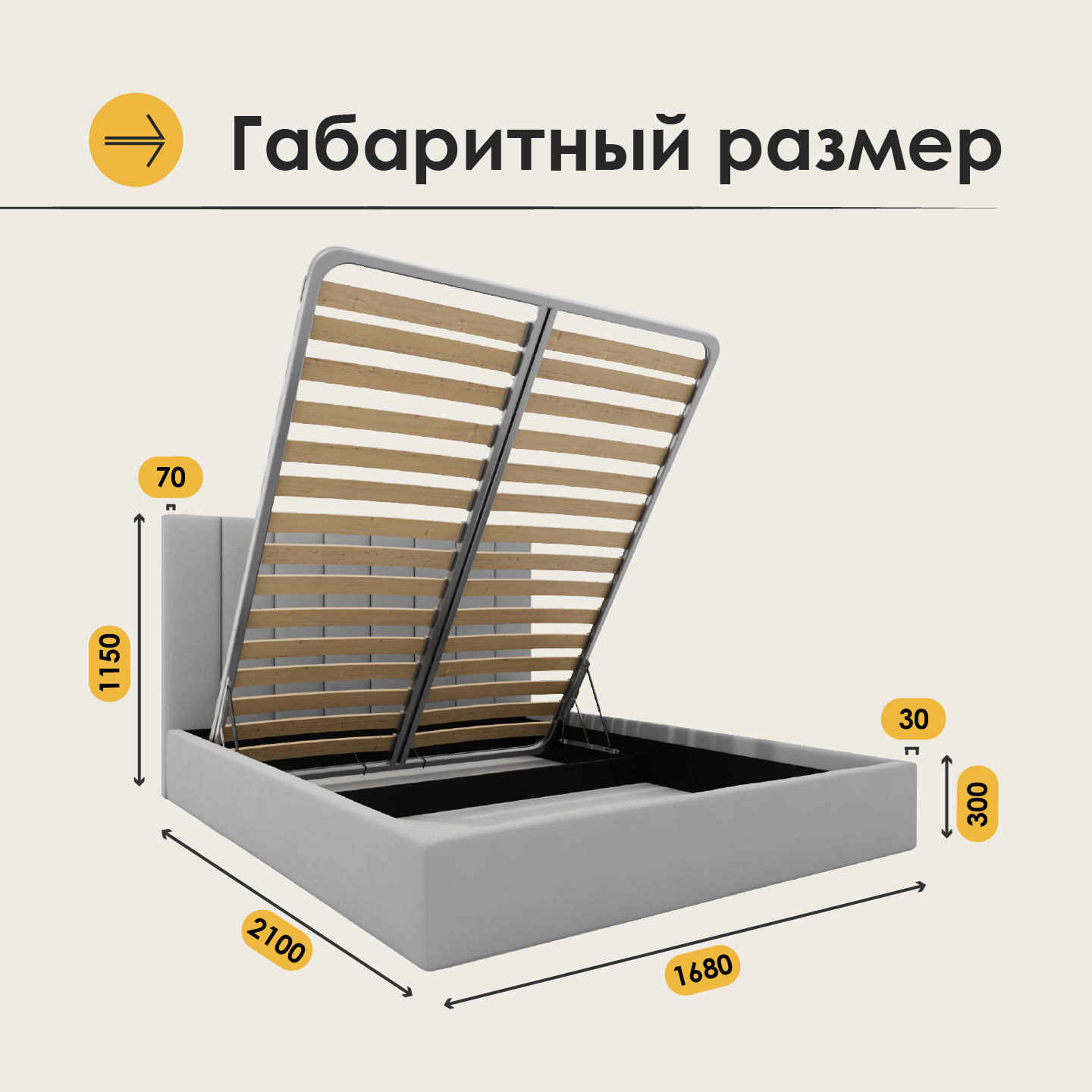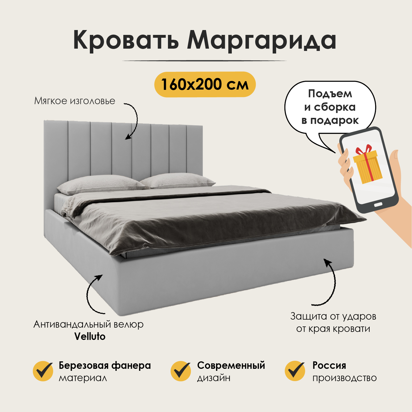 Кровать 160х200 двуспальная Маргарида, с подъёмным механизмом, с ящиками, с мягким изголовьем, светло-серая информация: