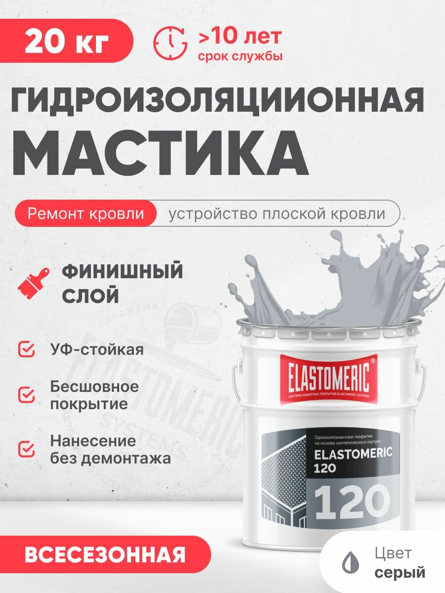 Гидроизоляция для плоской крыши ELASTOMERIC 120, мастика гидроизоляционная однокомпонентная (жидкая резина для кровли) финишный слой, серый, 20кг 15 786 ₽
