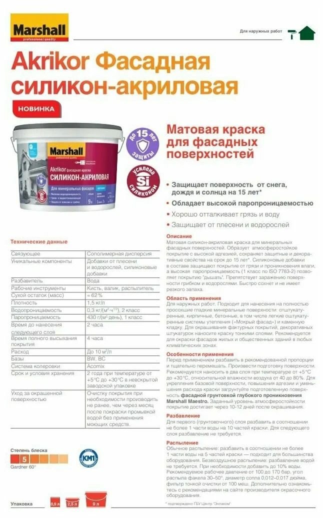 Краска фасадная силикон-акриловая Marshall Akrikor матовая база BW белая 9 л информация: