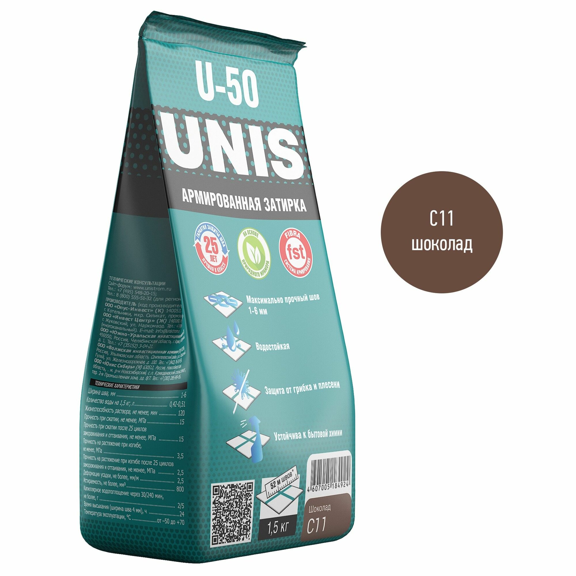 Затирка UNIS U-50 Шоколад С11 1,5 кг, сухая смесь, противогрибковая информация: