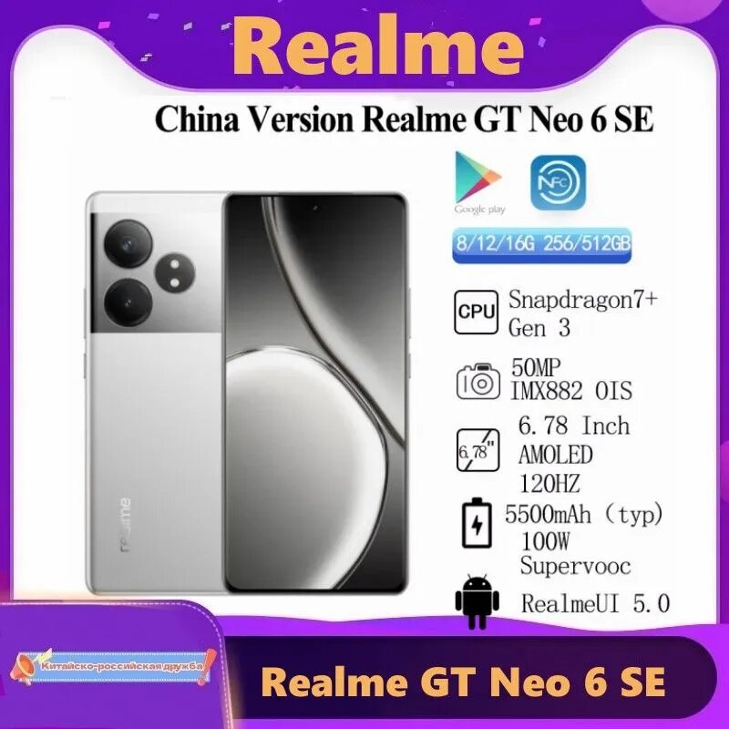 Смартфон Realme GT Neo 6 SE Unlocked, cnRomNoGoolge, Realme, GT Neo6 SE, Версия CN, Смартфон, Серебряный, 16ГБ, 512ГБ, china, новый, 01.04.2024
