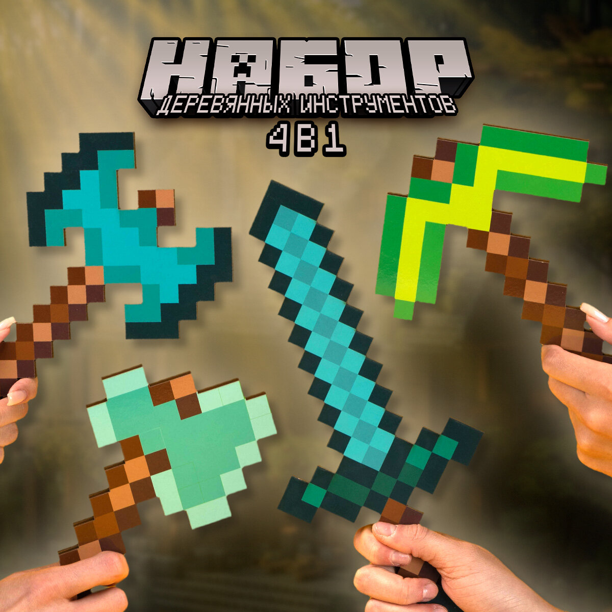 Набор оружия деревянное игрушечное "Minecraft", 4 шт, детское, яркий принт, +3 информация: