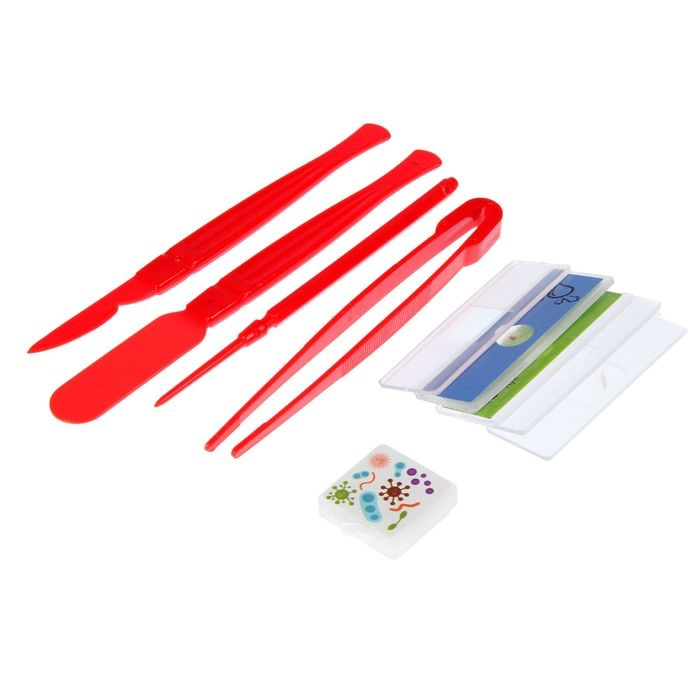 Набор биолога, 14 предметов: калейдоскоп, микроскоп, 4 слайда, 2 образца клеток, пинцет, нож, лопатк .