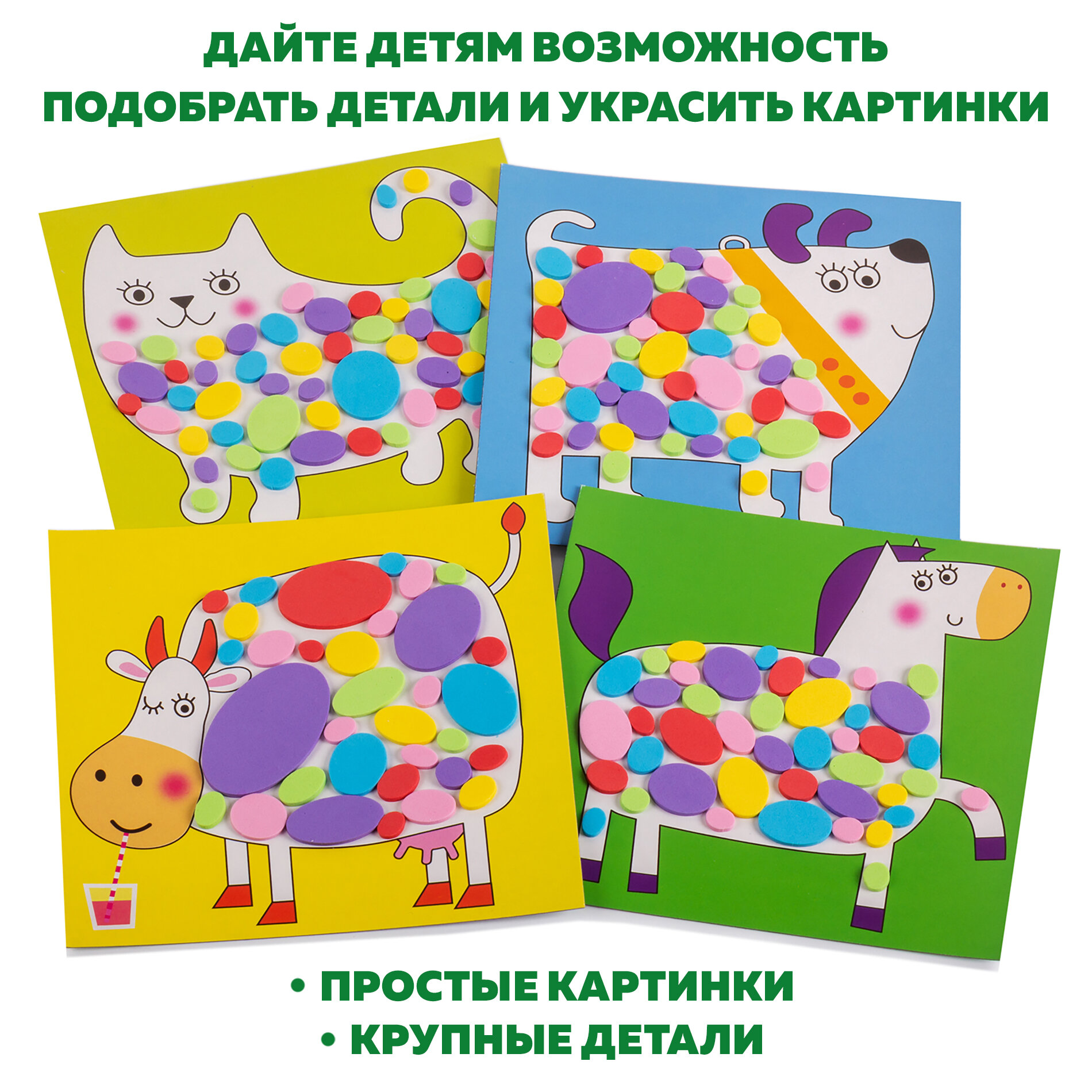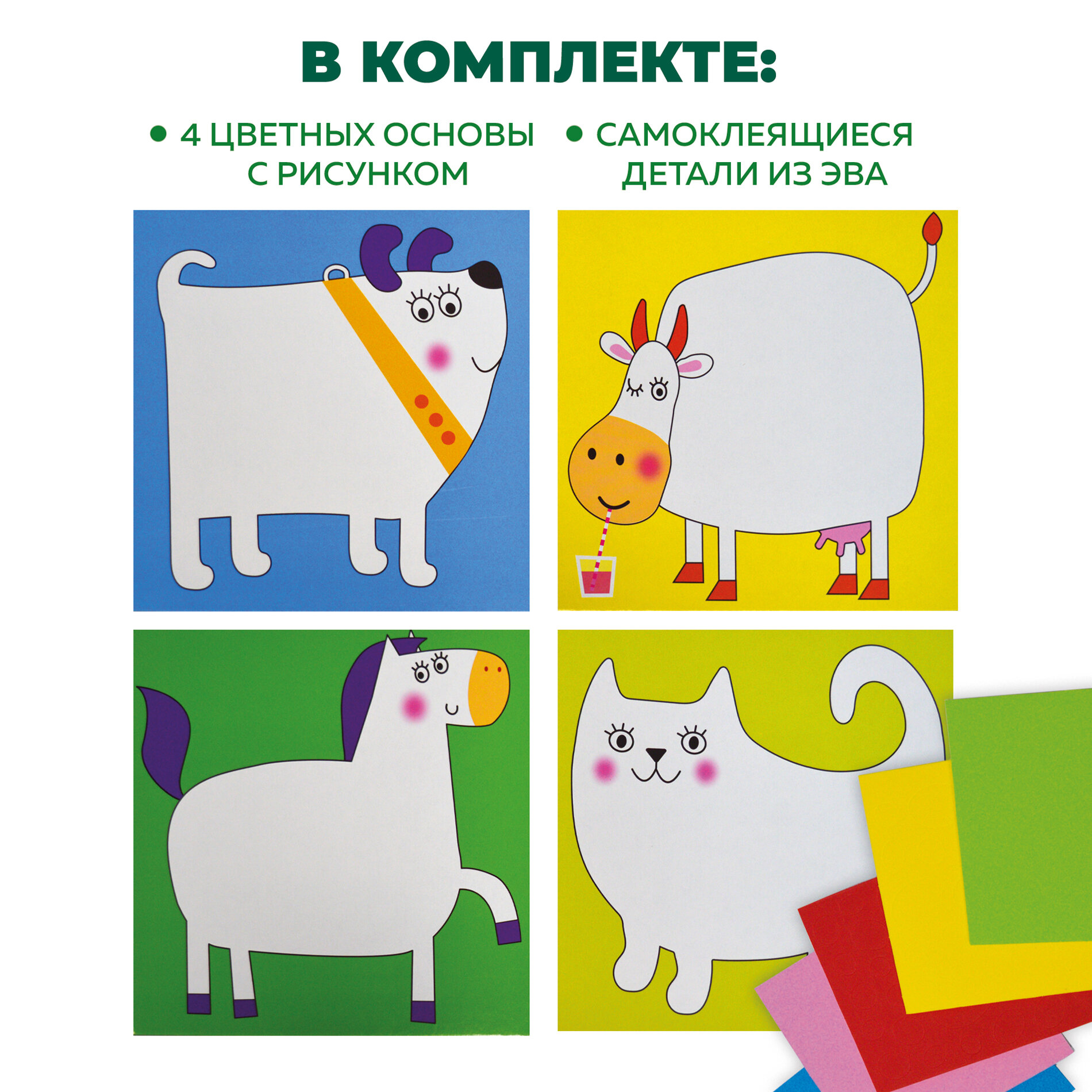 | Комплектация | В наборе: 4 цветные основы с рисунком-схемой, детали из ЭВА на самоклеящейся основе (6 цветов), декоративные элементы на самоклеящейся основе (глазки), цветная листовка-образец |