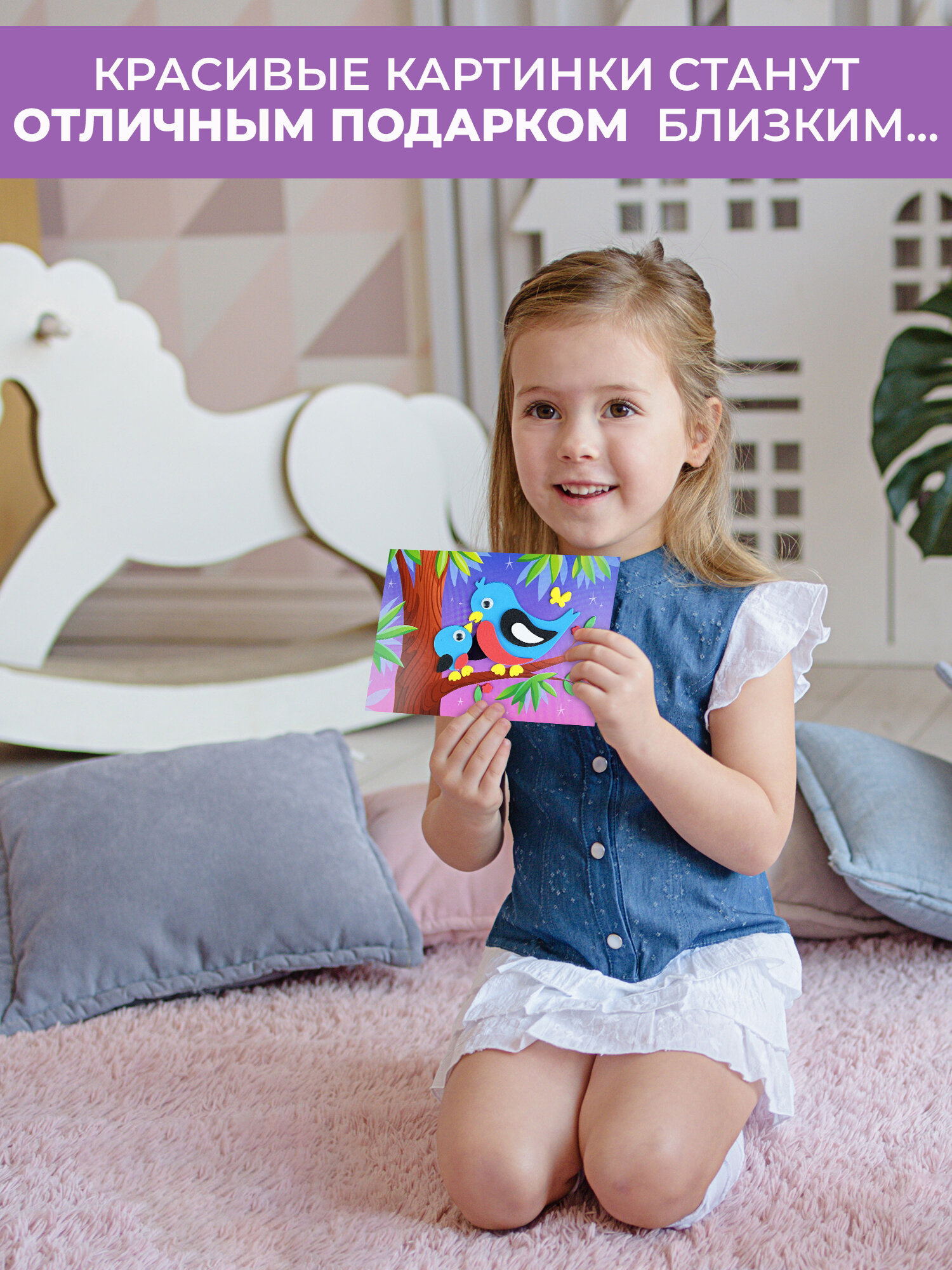 | Комплектация | В наборе: 4 цветные основы с рисунком-схемой, детали из ЭВА на самоклеящейся основе (6 цветов), декоративные элементы на самоклеящейся основе (глазки), цветная листовка-образец |