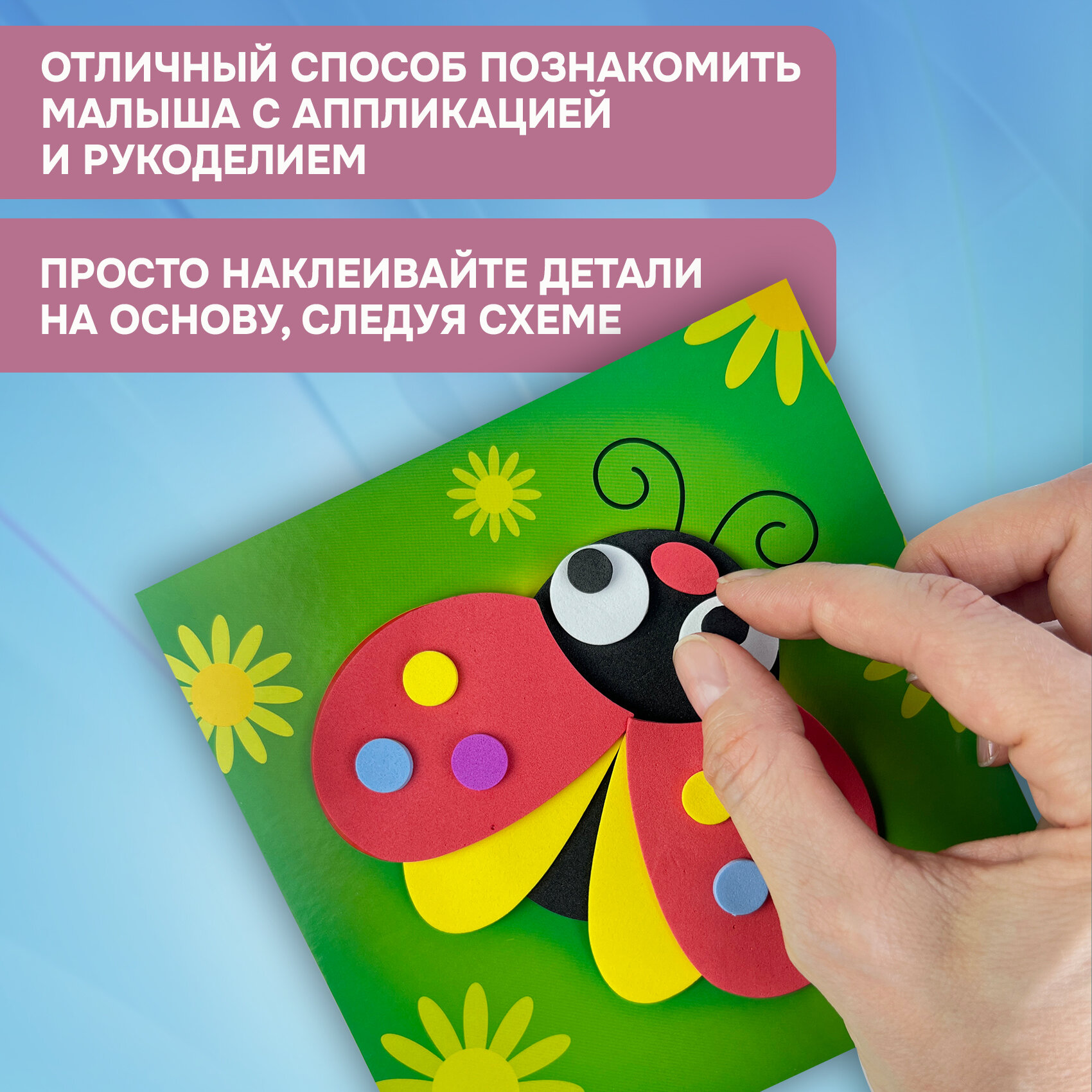 | Комплектация | В наборе: 4 цветные основы с рисунком-схемой, детали из ЭВА на самоклеящейся основе (6 цветов), декоративные элементы на самоклеящейся основе (глазки), цветная листовка-образец |