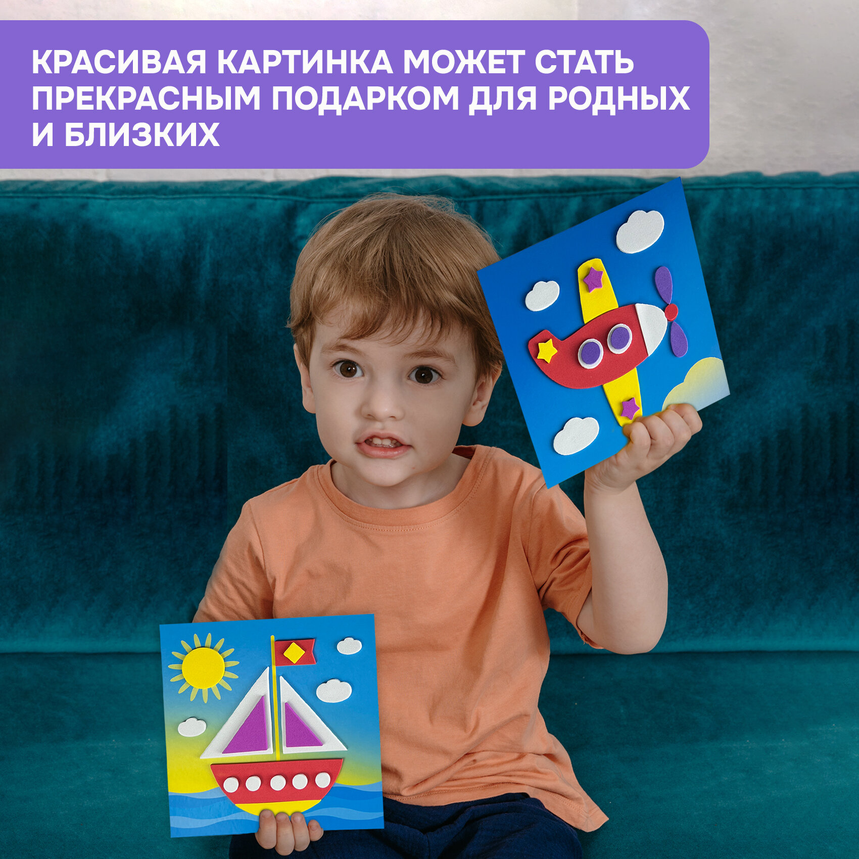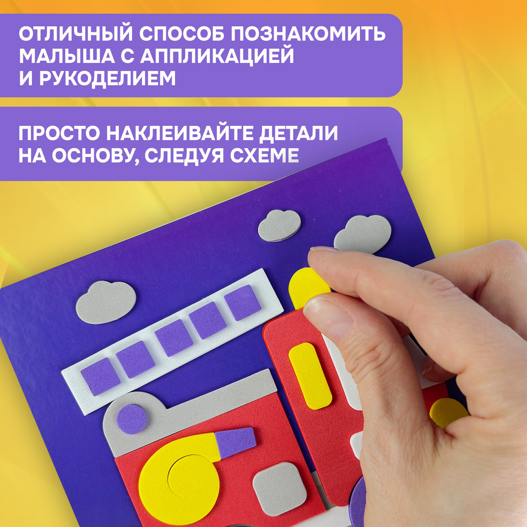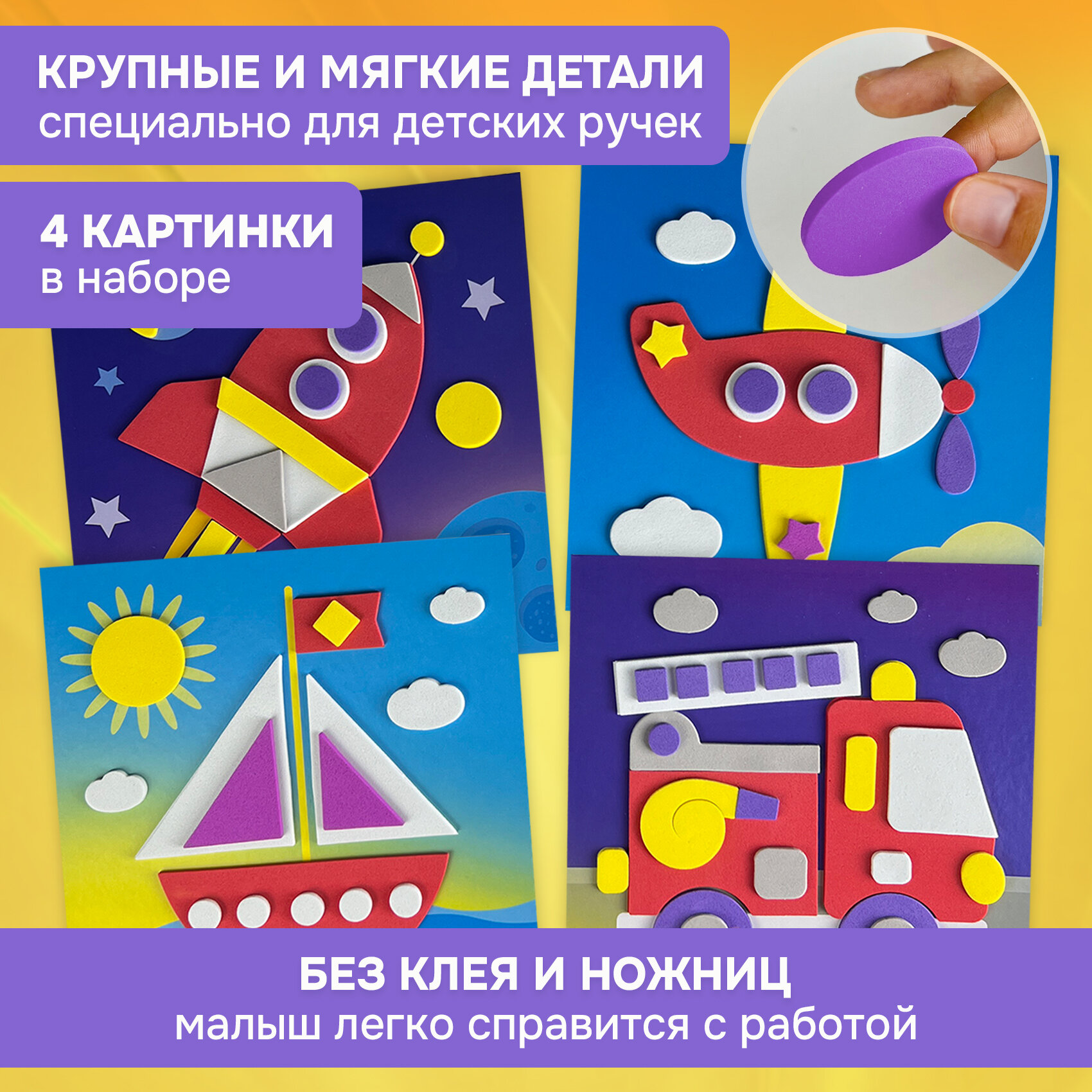 | Комплектация | В наборе: 4 цветные основы с рисунком-схемой, детали из ЭВА на самоклеящейся основе (6 цветов), декоративные элементы на самоклеящейся основе (глазки), цветная листовка-образец |