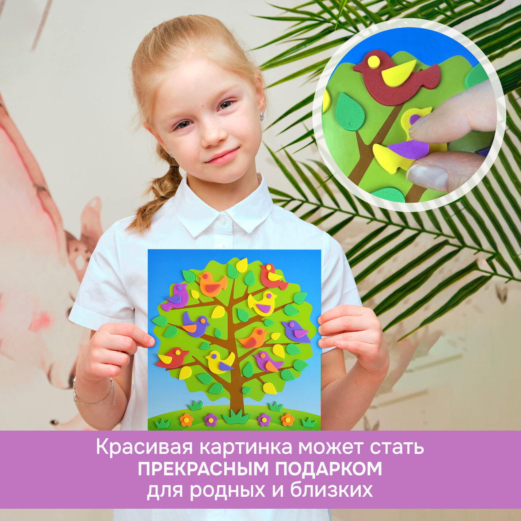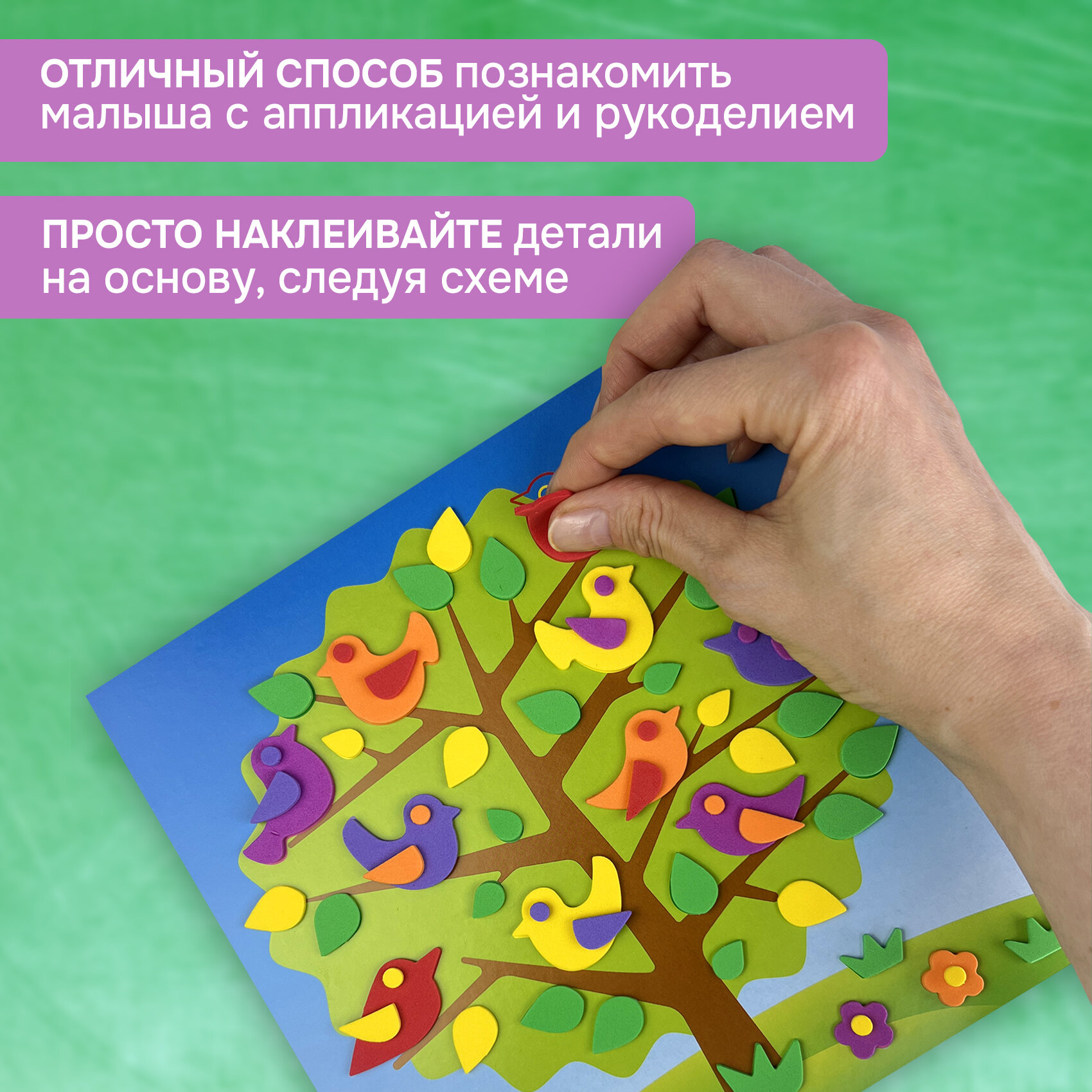 | Комплектация | В наборе: 4 цветные основы с рисунком-схемой, детали из ЭВА на самоклеящейся основе (6 цветов), декоративные элементы на самоклеящейся основе (глазки), цветная листовка-образец |