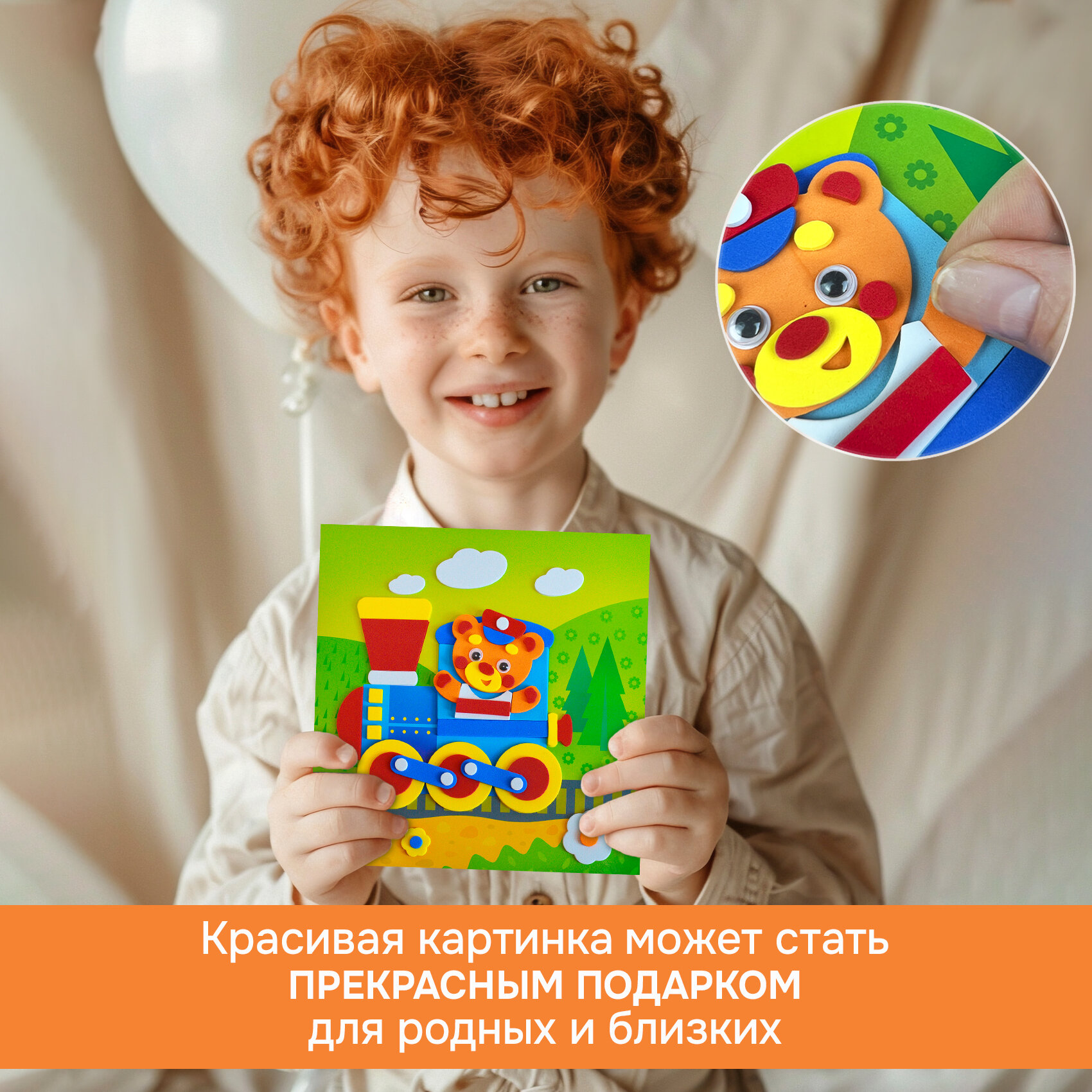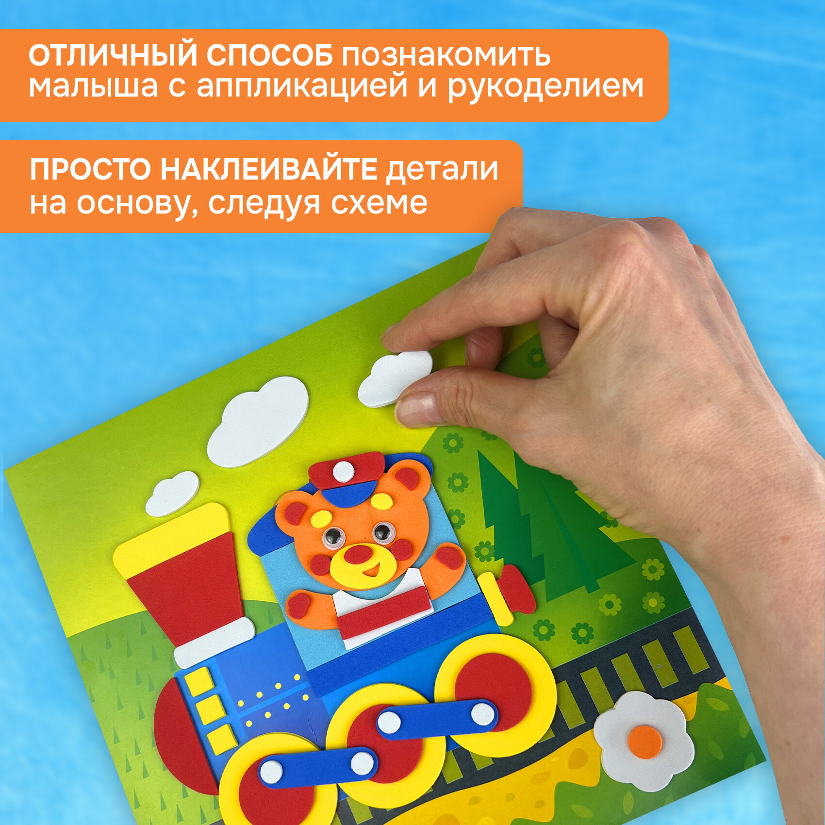 | Комплектация | В наборе: 4 цветные основы с рисунком-схемой, детали из ЭВА на самоклеящейся основе (6 цветов), декоративные элементы на самоклеящейся основе (глазки), цветная листовка-образец |