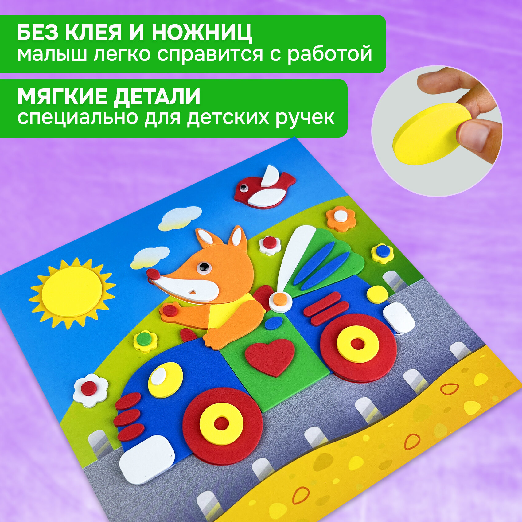 | Комплектация | В наборе: 4 цветные основы с рисунком-схемой, детали из ЭВА на самоклеящейся основе (6 цветов), декоративные элементы на самоклеящейся основе (глазки), цветная листовка-образец |