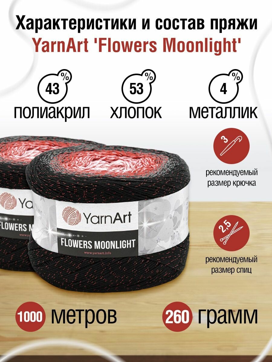 Пряжа YarnArt Flowers Moonlight черный-белый-коралл (3260), 53%хлопок/43%акрил/4%металлик, 1000м, 260г, 2шт