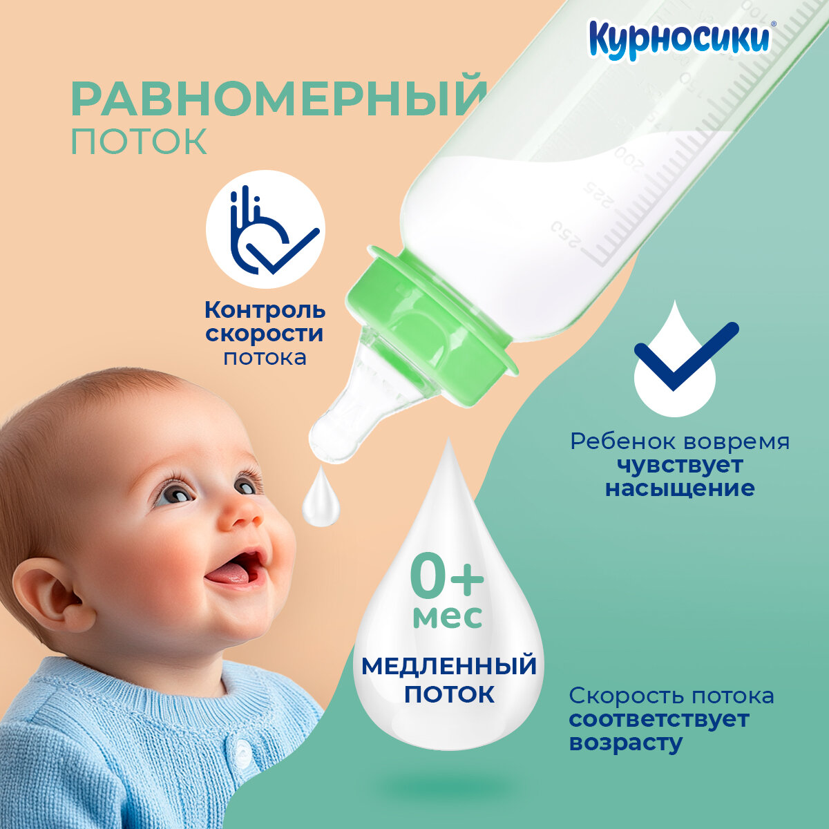 Бутылочка для кормления новорожденного Курносики с силиконовой соской молочной 250 мл, набор из 5 штук, зеленый 770 ₽