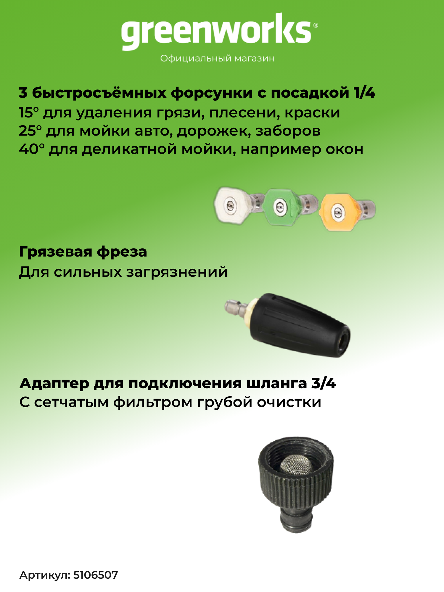 Подробная комплектация | Мойка высокого давления Greenworks Арт. 5106507; Шланг высокого давления; Пистолет с трубкой-удлинителем; Набор из 3-х насадок с различными углами распыления для различных задач: 15 градусов -для удаления грязи, плесени, краски, 25 градусов -универсальная насадка, 40 градусов - для деликатной мойки;. Ротационная насадка (турбо фреза); Насадка - пеногенератор; Руководство по эксплуатации; Гарантийный талон. |