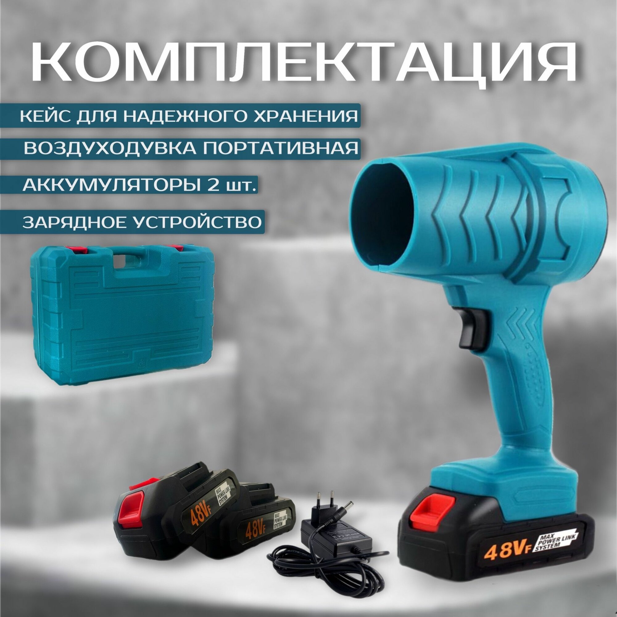 | Подробная комплектация | Воздуходувка, 2 аккумулятора, зарядное устройство, чемодан |