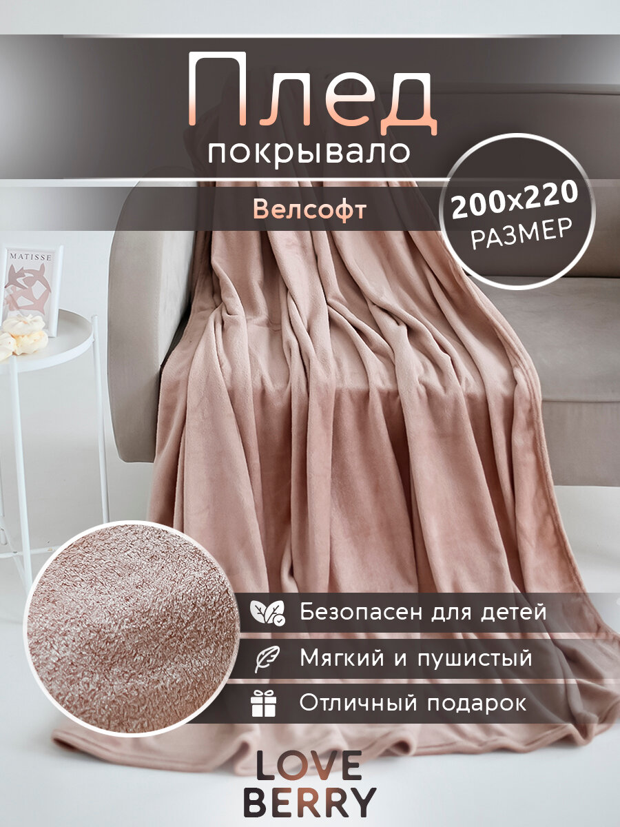 Плед 200х220 LOVEBERRY из велсофта Евро в спальню однотонный, подарок маме информация:
